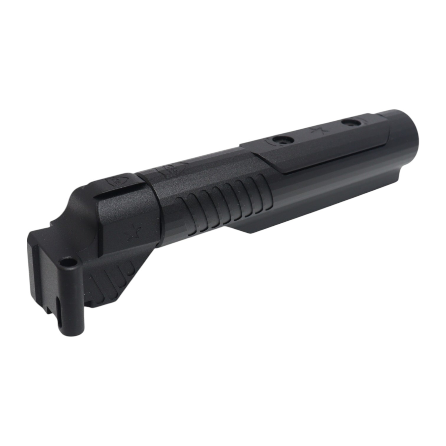 Ключевая особенность трубы — специальный расклинивающий механизм, который позволяет устанавливать как приклады стандарта Mil-spec, так и Com-spec, полностью исключая люфт.