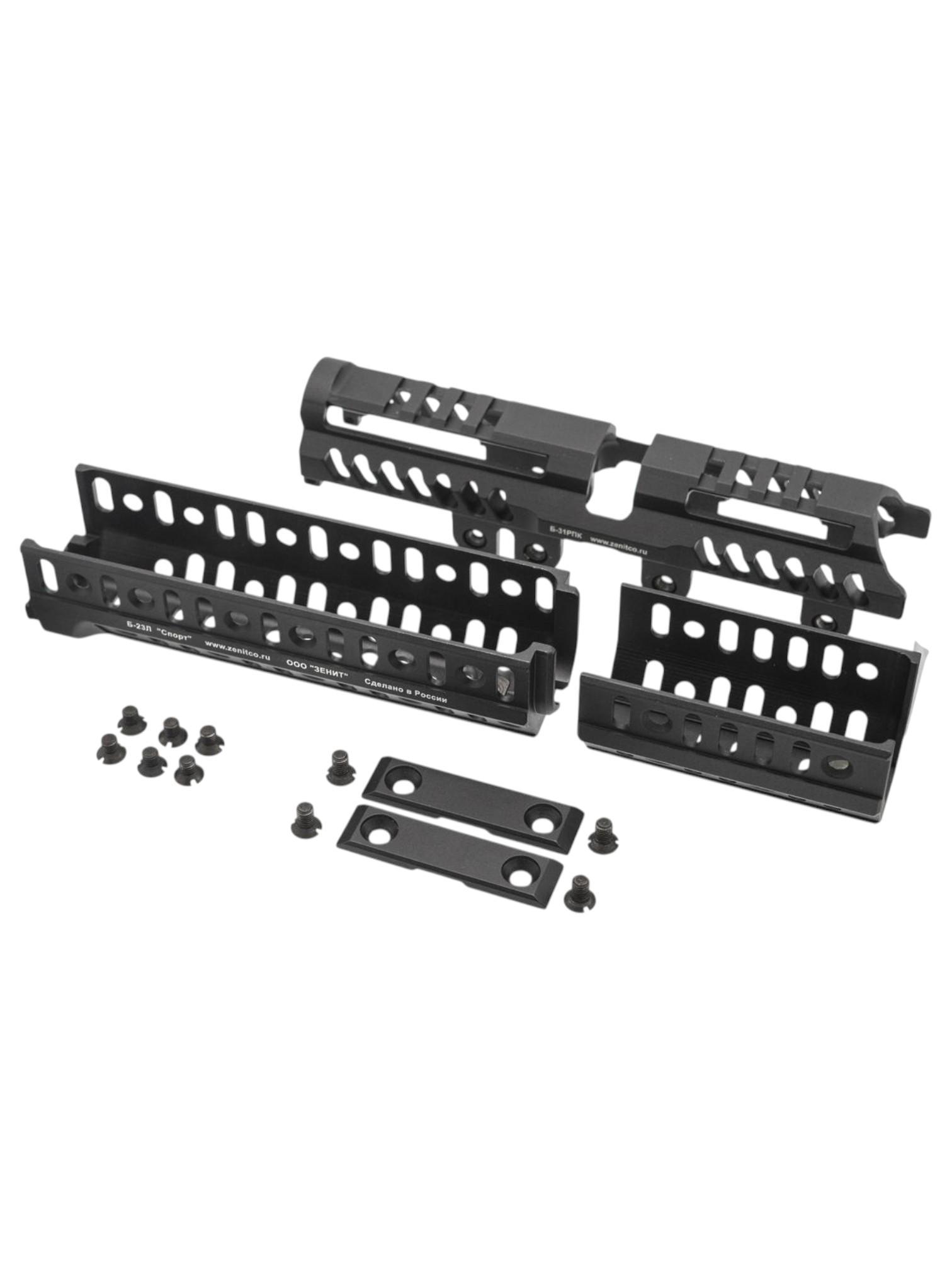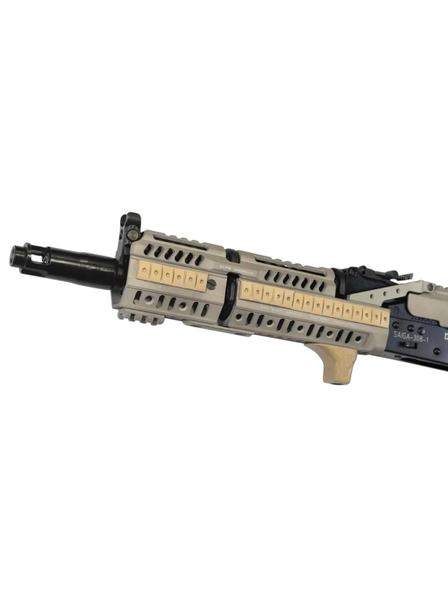 Комплект «Спорт-8» предлагает модернизацию стандартного цевья карабина «Сайга-308» (исполнение 46 и 61) с использованием многофункциональных направляющих Базис, расположенных по пяти сторонам.