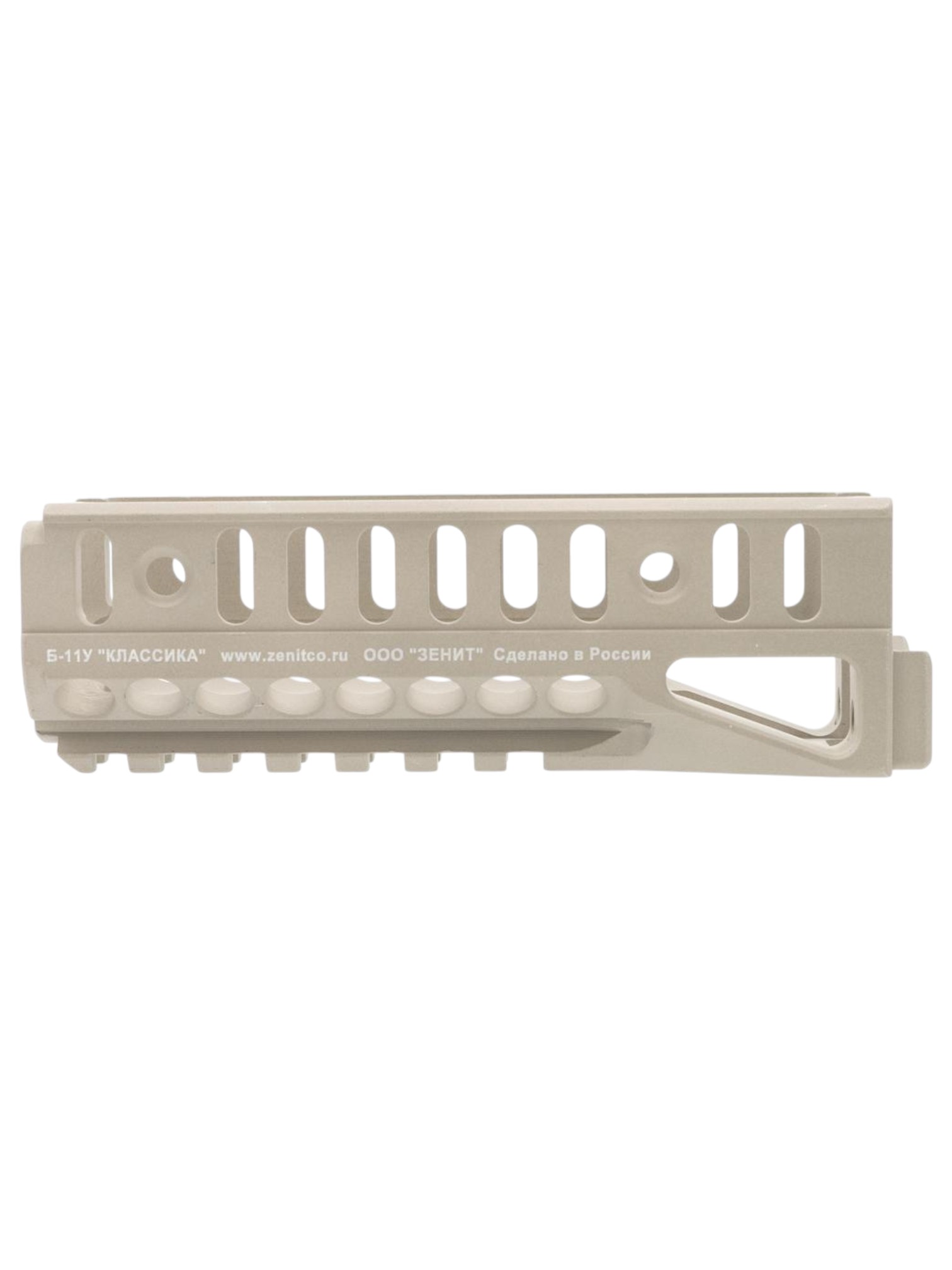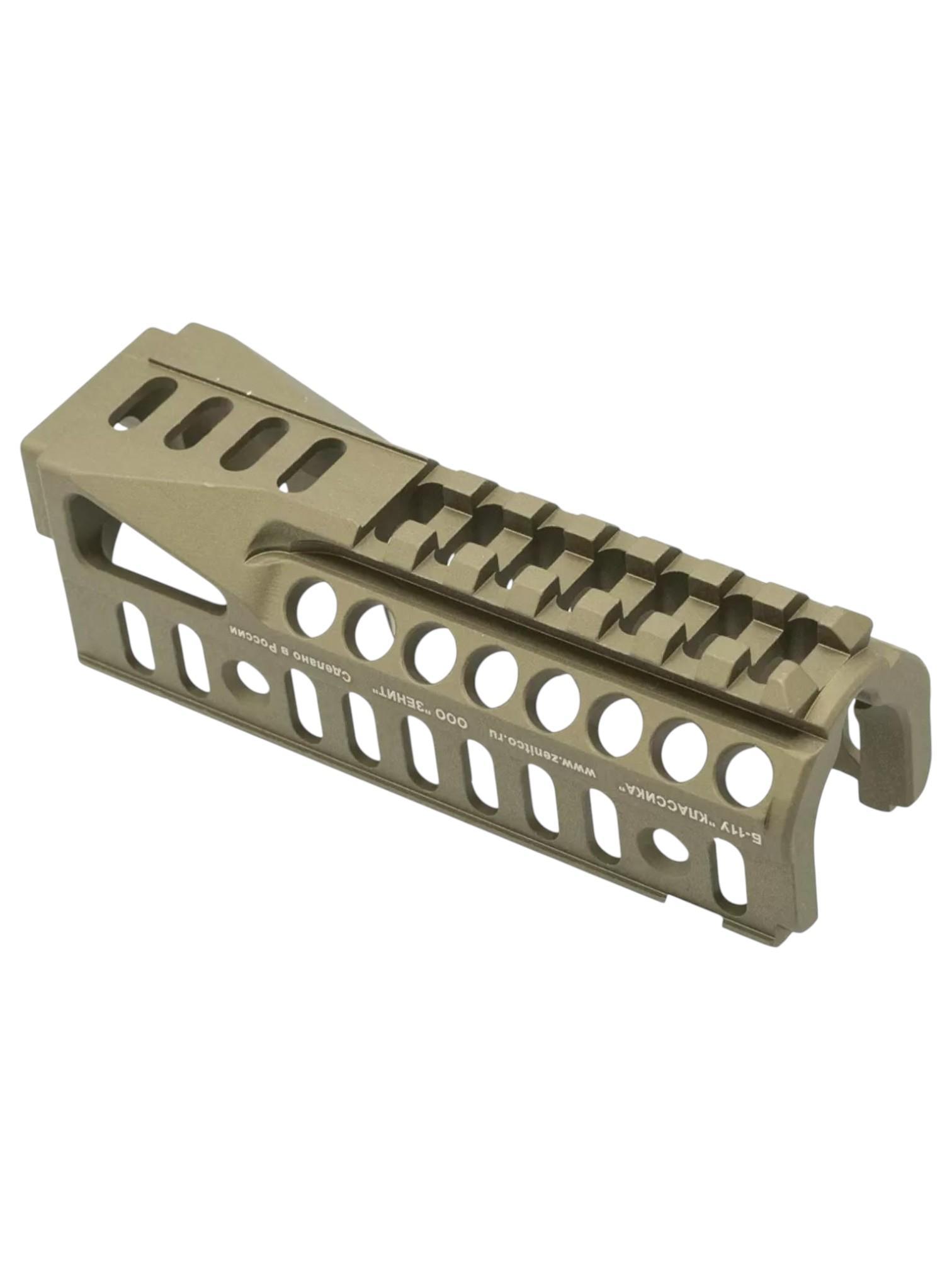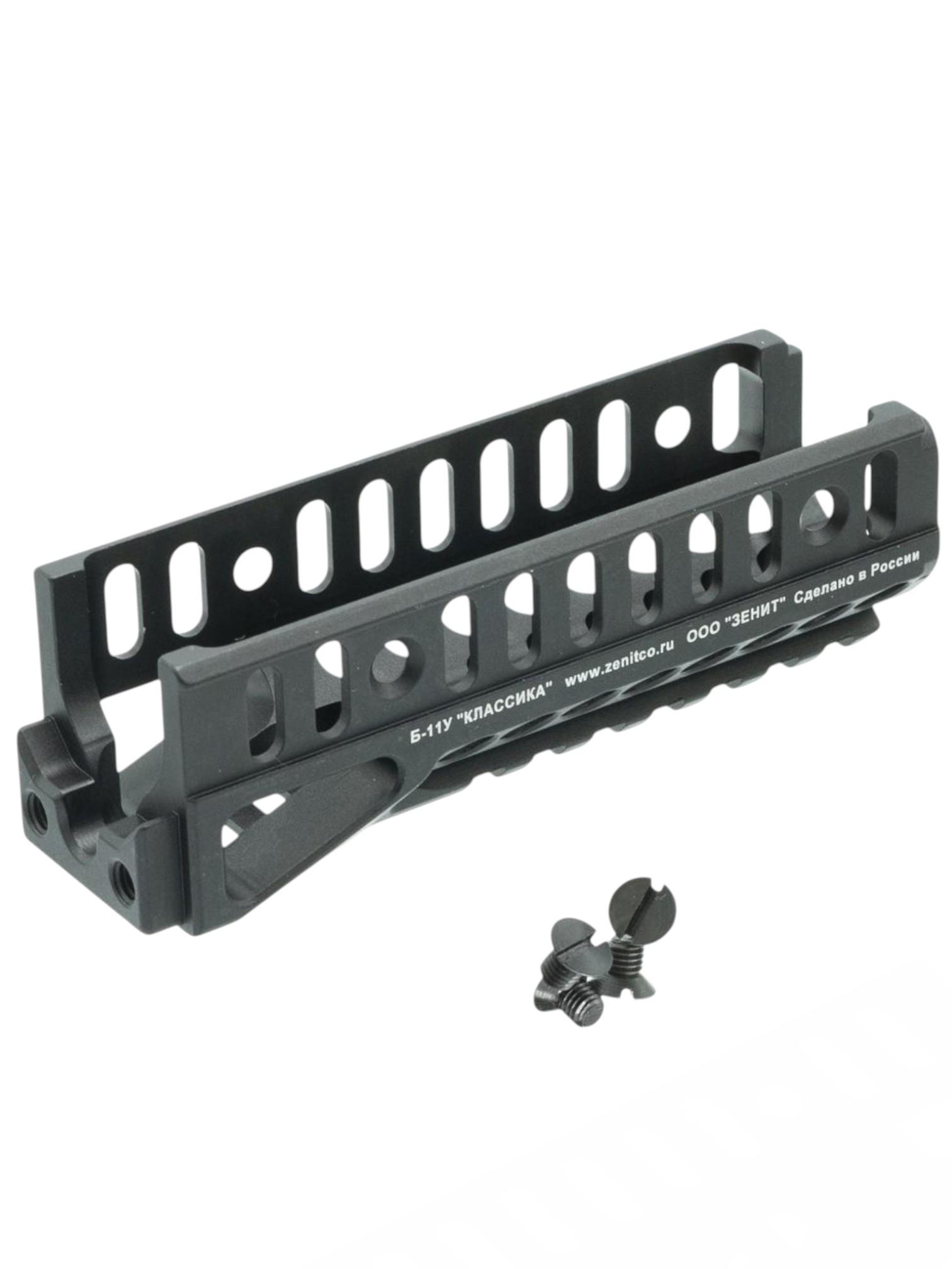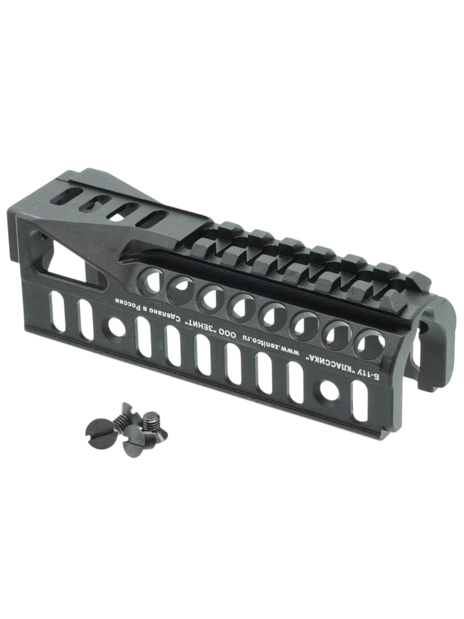 Модульная конструкция позволяет заменить штатное цевье АКС-74У, предлагая улучшенные возможности для крепления дополнительного оборудования. В нижней части цевья интегрирована планка Пикатинни, предназначенная для установки широкого спектра аксессуаров, таких как подствольные фонари, ЛЦУ, дополнительные рукоятки и кронштейны.