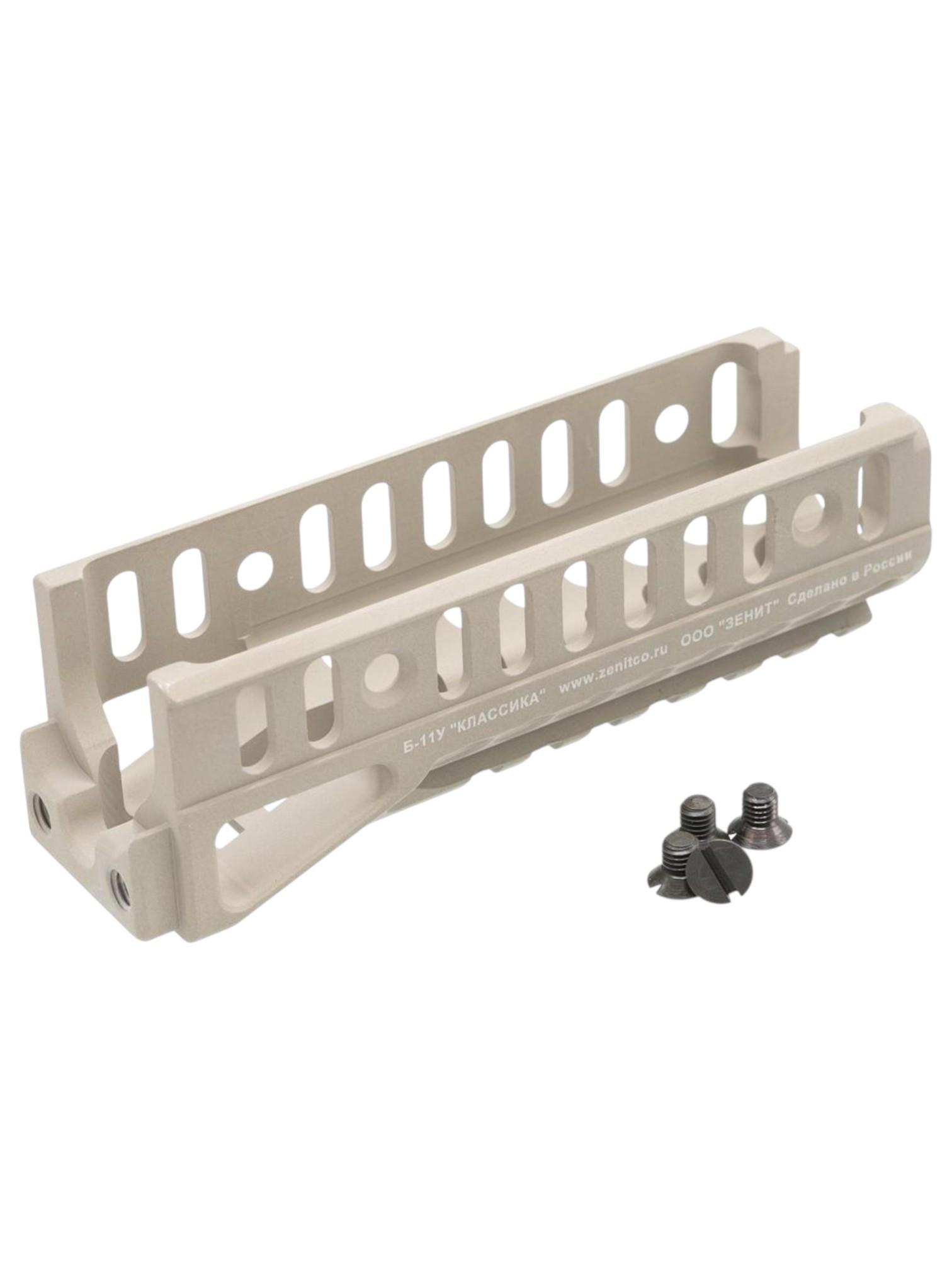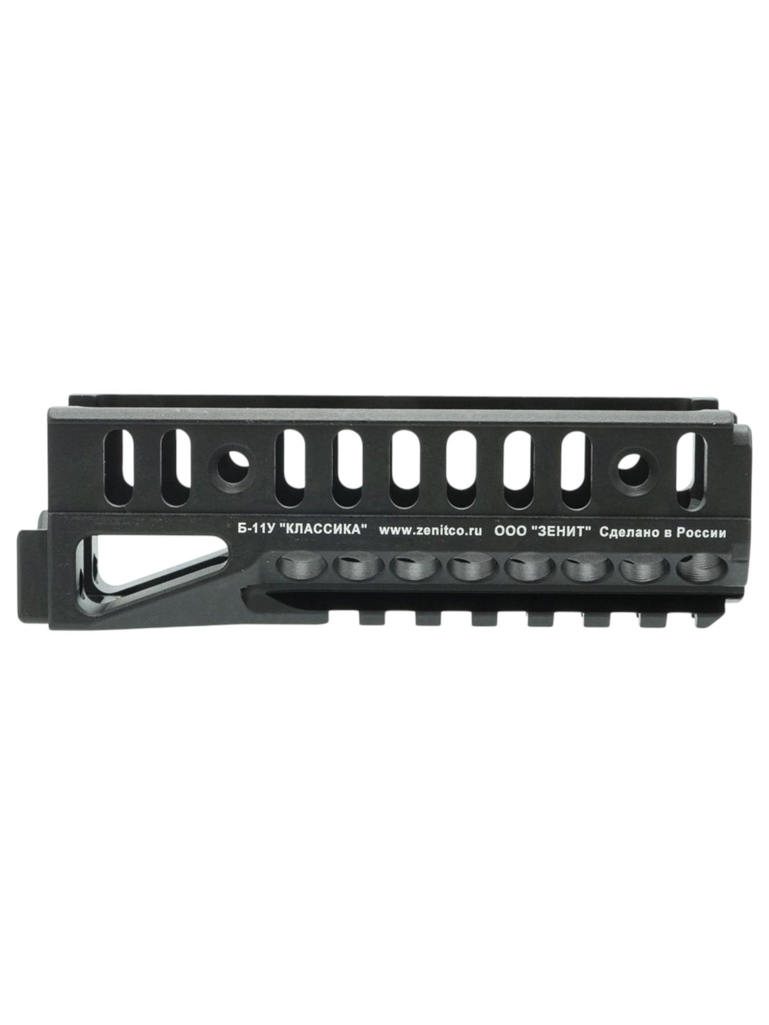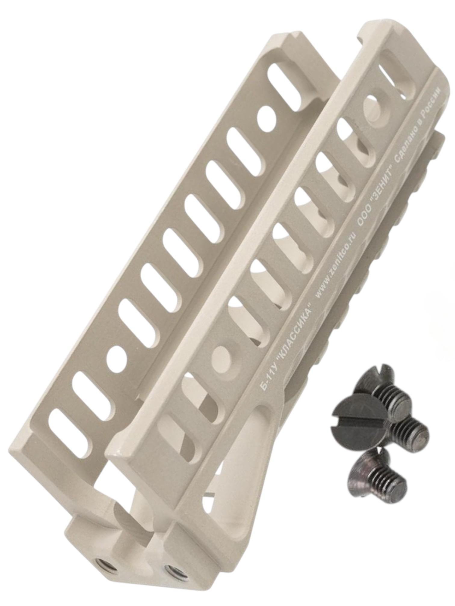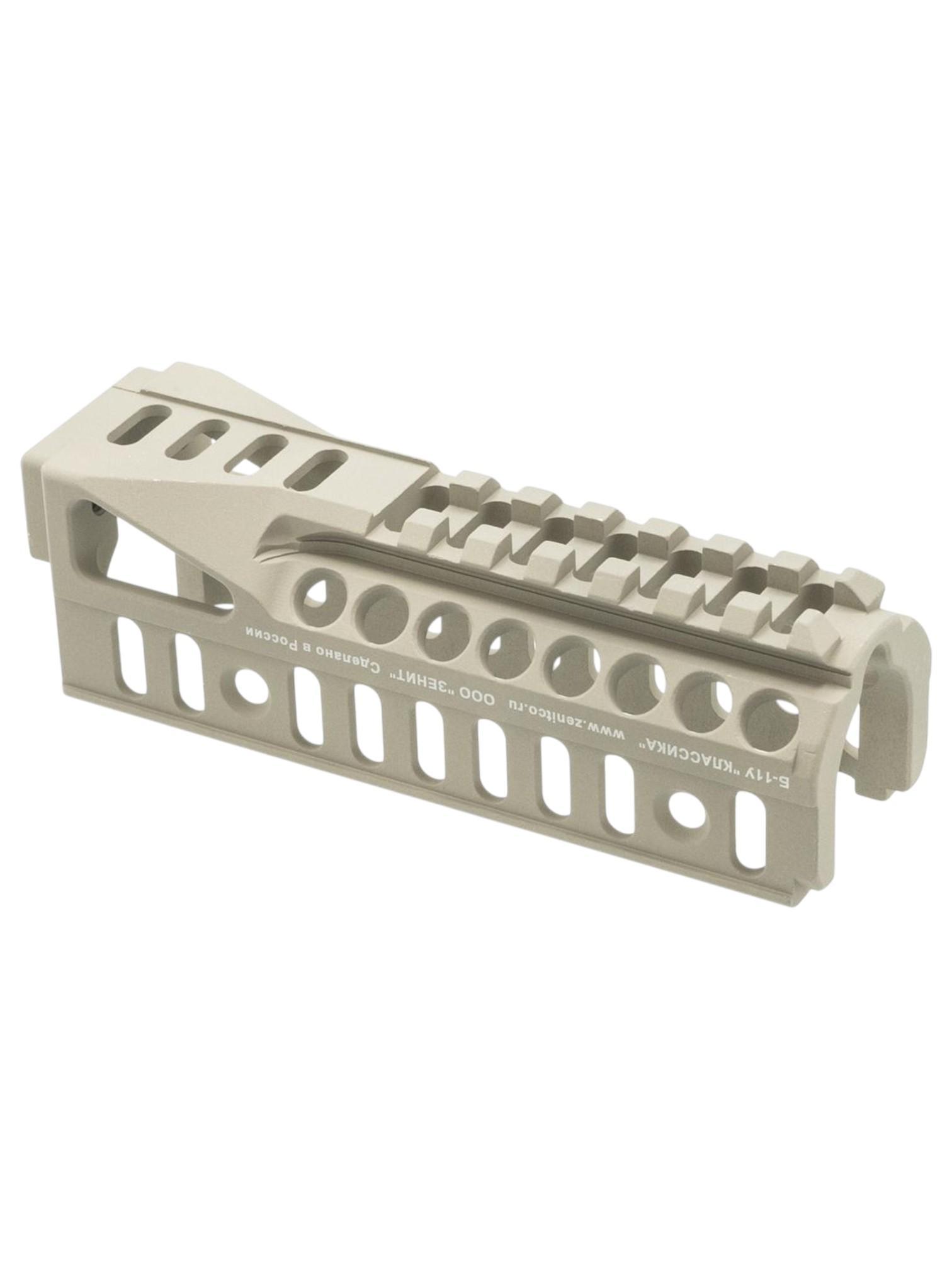Модульная конструкция позволяет заменить штатное цевье АКС-74У, предлагая улучшенные возможности для крепления дополнительного оборудования. В нижней части цевья интегрирована планка Пикатинни, предназначенная для установки широкого спектра аксессуаров, таких как подствольные фонари, ЛЦУ, дополнительные рукоятки и кронштейны.