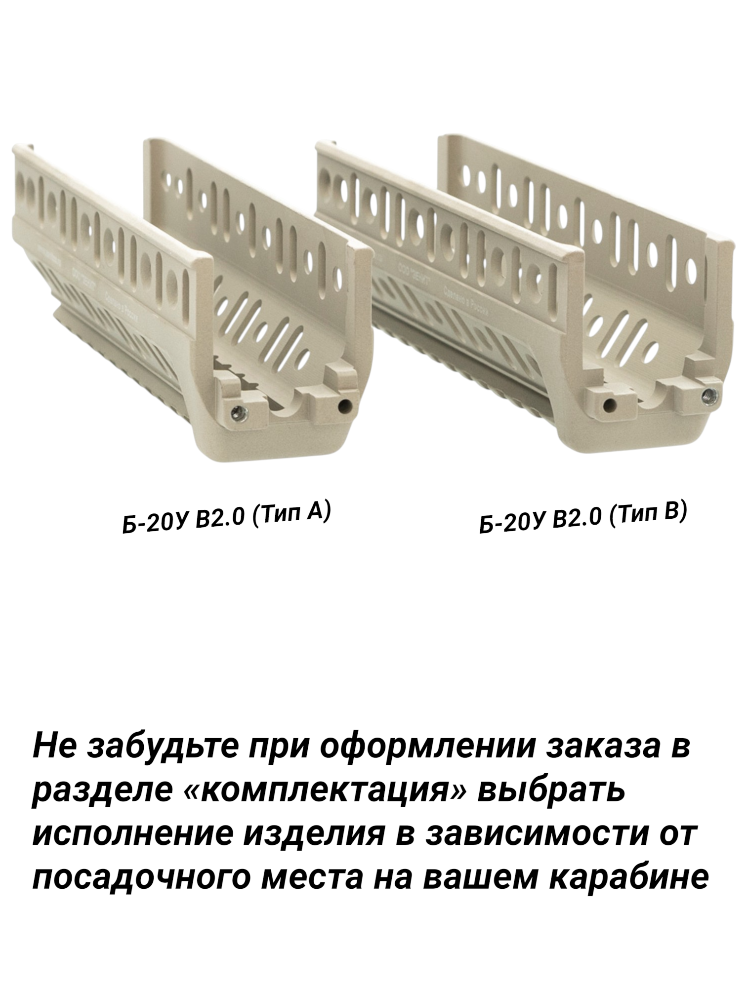 У разных карабинов посадочные места могут отличаться, поэтому перед покупкой сверьте внешний вид Вашего штатного цевья с фото. Возможны два типа: тип А с более широким посадочным местом и тип B с более низким посадочным местом. Типу А соответствует исполнение Б-20У В.2.0, Типу B - Б-20У В.2.1.