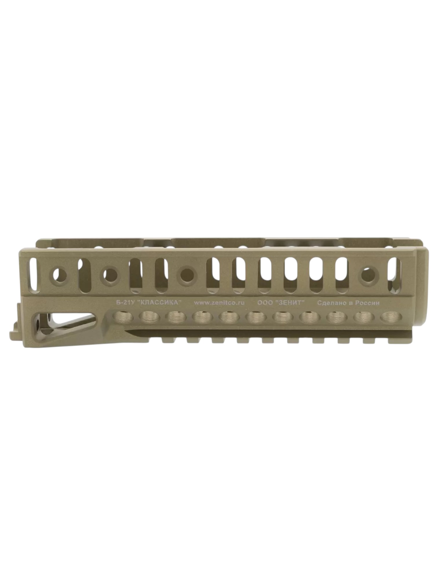 Цельнофрезерованное цевьё Б-21У изготовлено из сплава алюминия Д16Т с покрытием черного цвета или цвета "пустыня", предназначено для установки на штатное место цевья самозарядного карабина Сайга-9 и ПП «Витязь СН».