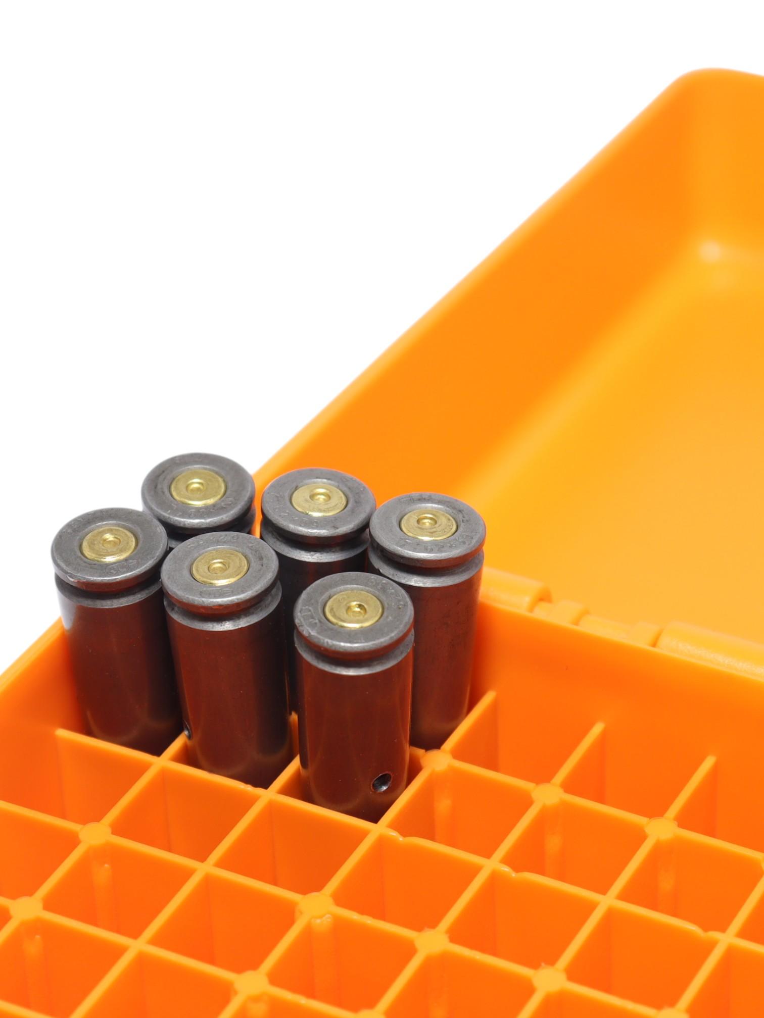 Патроны лежат в отдельных ячейках, поэтому не царапаются и не деформируются. Прочный полипропилен защищает от ударов, влаги и пыли, а крепкая защёлка не даст кейсу открыться случайно.