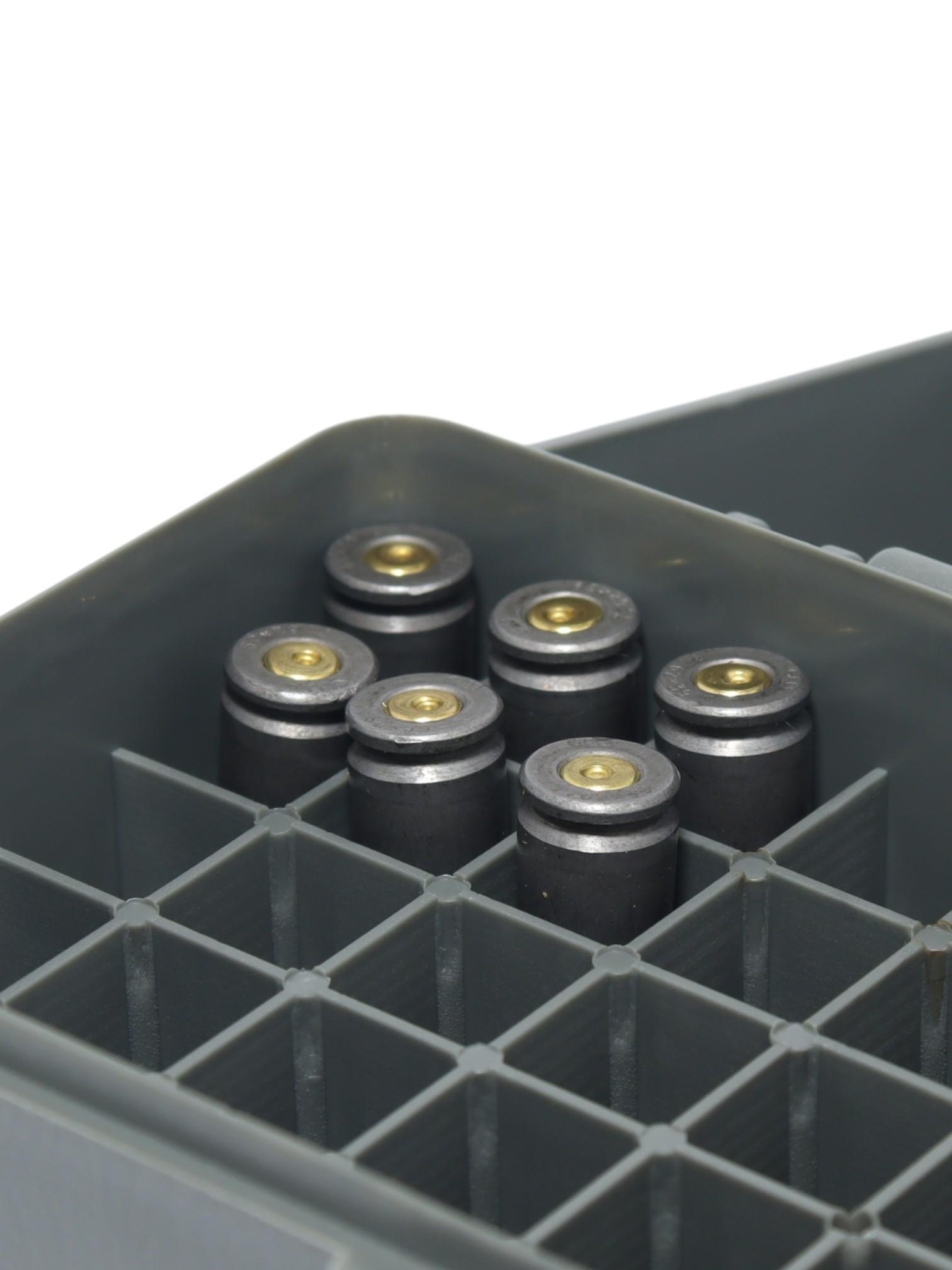 Каждый патрон стоит в отдельной ячейке, поэтому боеприпасы не трутся друг о друга и не повреждаются. Корпус сделан из прочного серого полипропилена с толстыми стенками, которые защищают от ударов, падений, влаги и пыли. Надёжный замок-защёлка не откроется сам по себе, а текстурная поверхность исключает скольжение в руках.