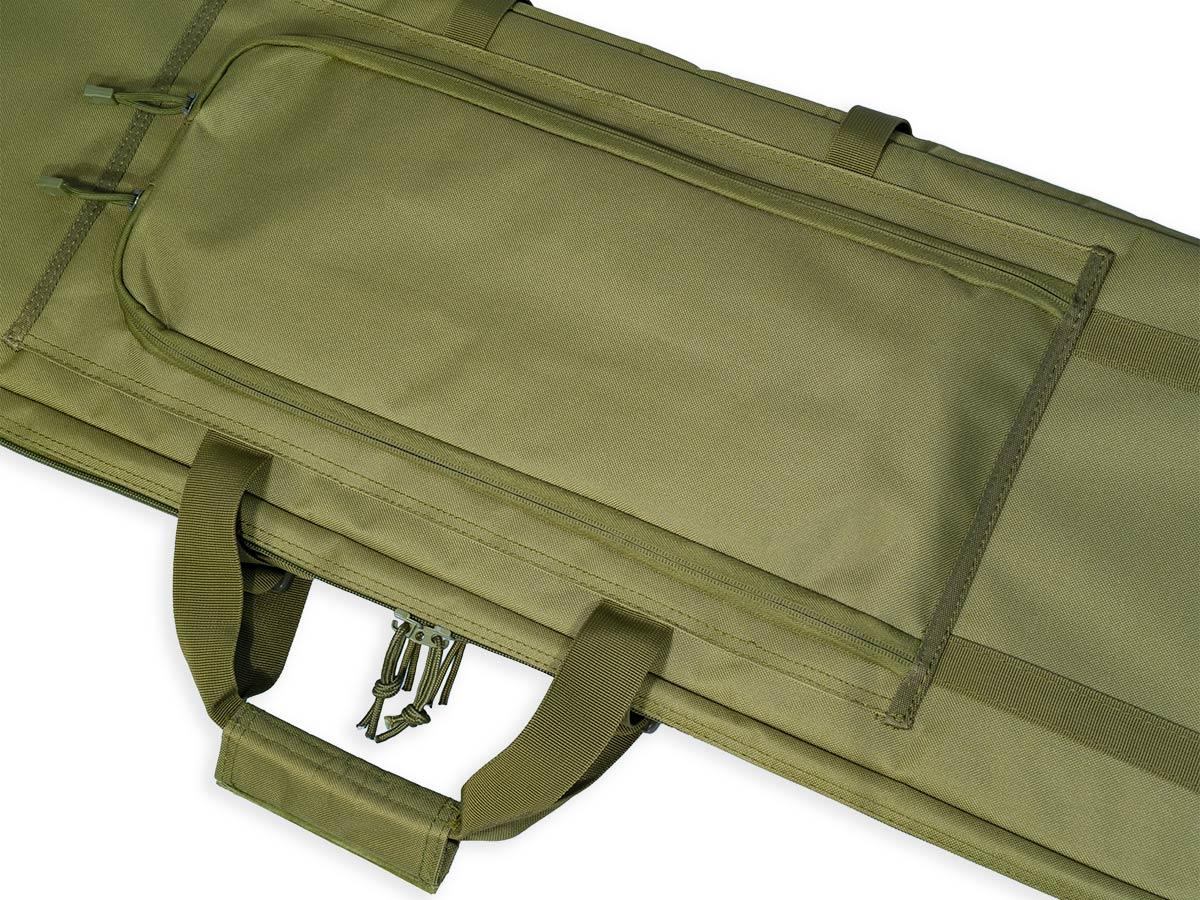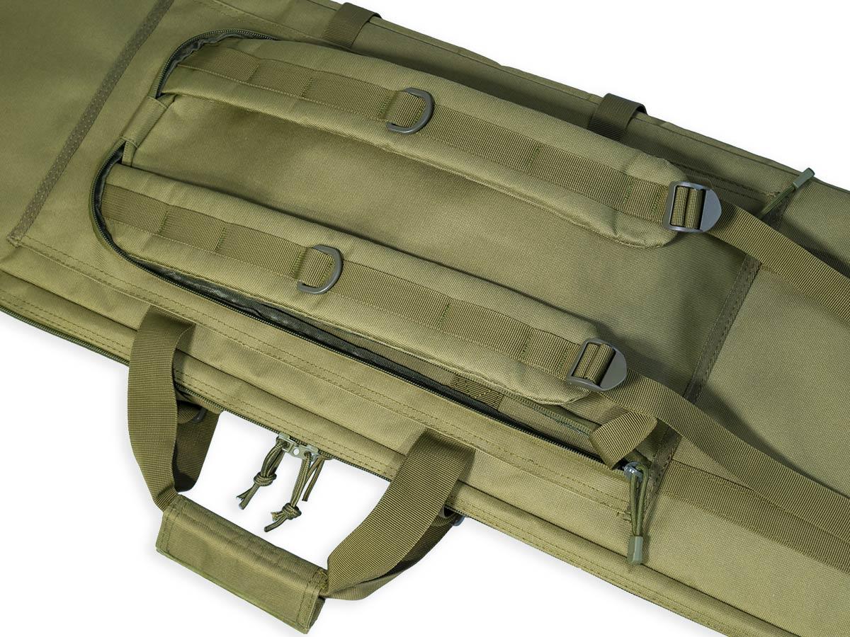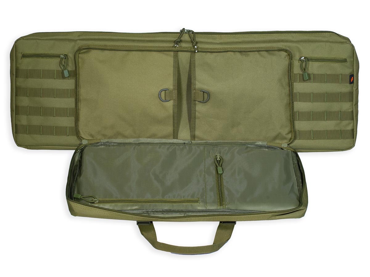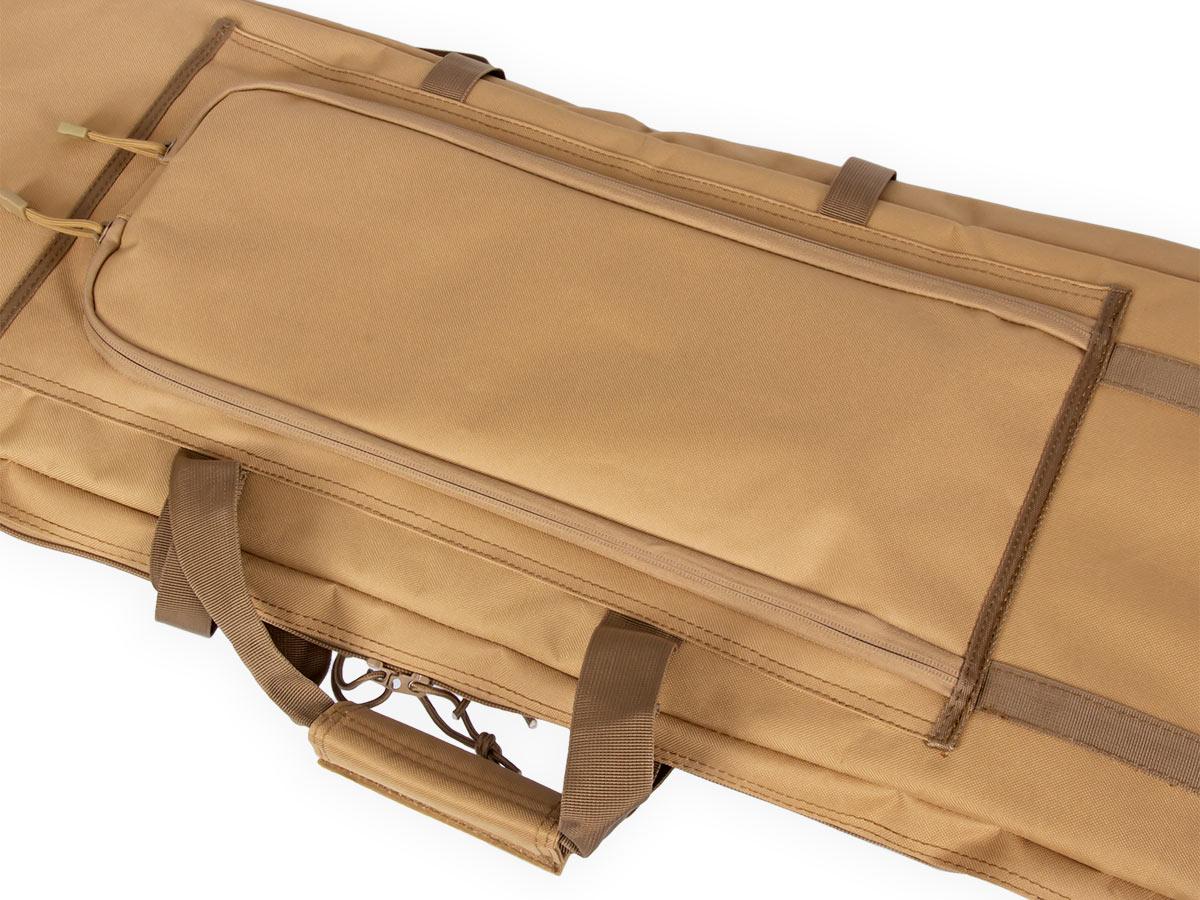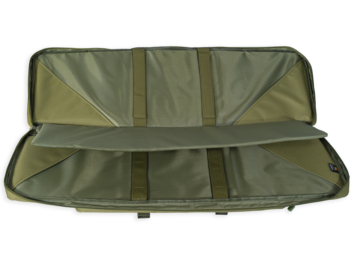Внутренние размеры основного отделения составляют 92x29x6 см. Для размещения и фиксации оружия предусмотрены угловые карманы на торцах чехла и нейлоновые стропы с липучками Velcro. Для того, чтобы две единицы оружия не соприкасались, посередине отделения размещена амортизирующая перегородка-разделитель толщиной 8 мм из материала Eva.