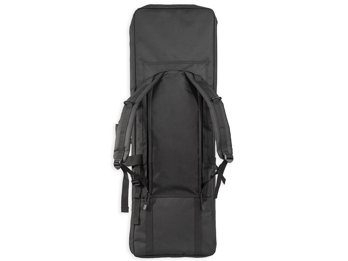 Для переноски кейса предусмотрены прочные нейлоновые ручки с мягкой накладкой. Можно уменьшить объём кейса, чтобы оружие внутри не болталось, с помощью нейлоновых строп с фастексами и петлями. Это особенно важно при транспортировке оружия с установленным оптическим прицелом. На задней стороне чехла размещено отделение, в которым находятся регулируемые плечевые лямки. Лёгким движением руки чехол превращается в элегантный рюкзак.
