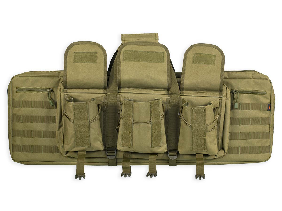 Сам кейс изготовлен из прочного износостойкого полиэстера с влагозащитной пропиткой. Боковые стенки и нижняя часть усилены плотным амортизирующим уплотнителем для защиты содержимого от ударов и повреждений. На лицевой стороне кейса расположены 6 карманов, в которых можно разместить магазины, патроны, перчатки, бинокль, дальномер и другие стрелковые аксессуары. Также на лицевой стороне нашиты стропы MOLLE для крепления дополнительных подсумков.