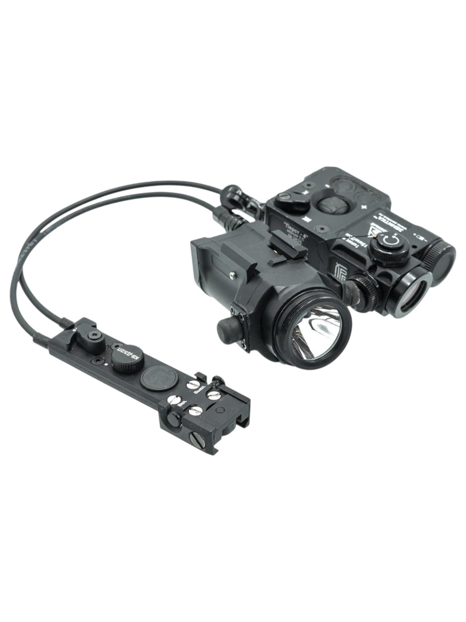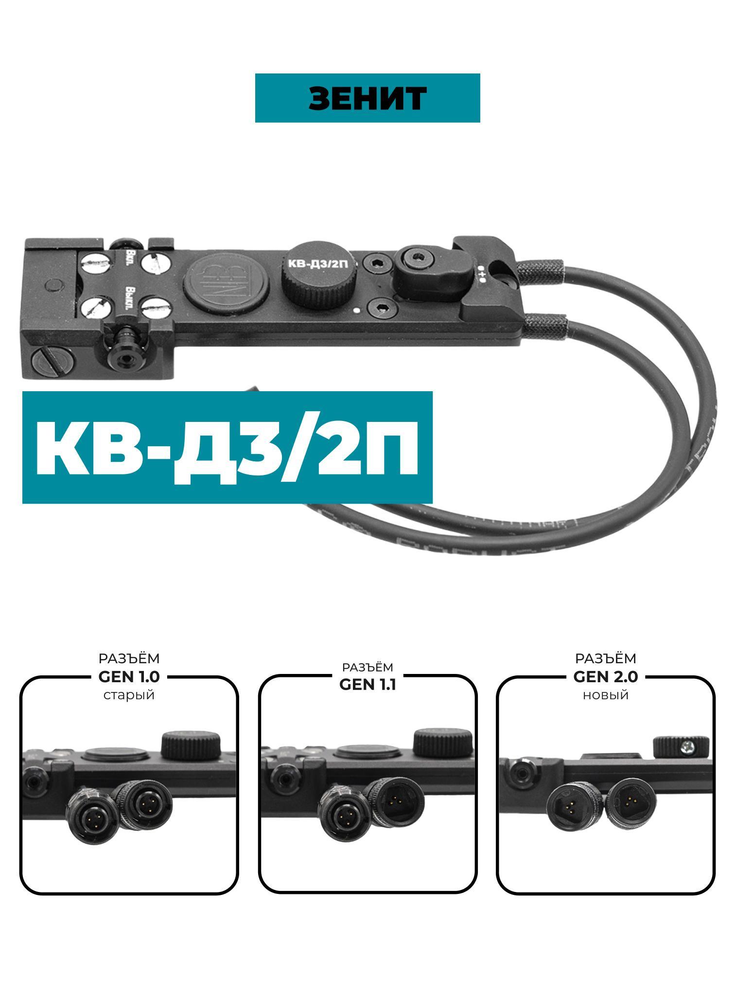 Кнопка выносная КВ-Д3/2П с возможностью крепления на направляющую Базис или планку Пикатинни предназначена для одновременного управления двумя устройствами.