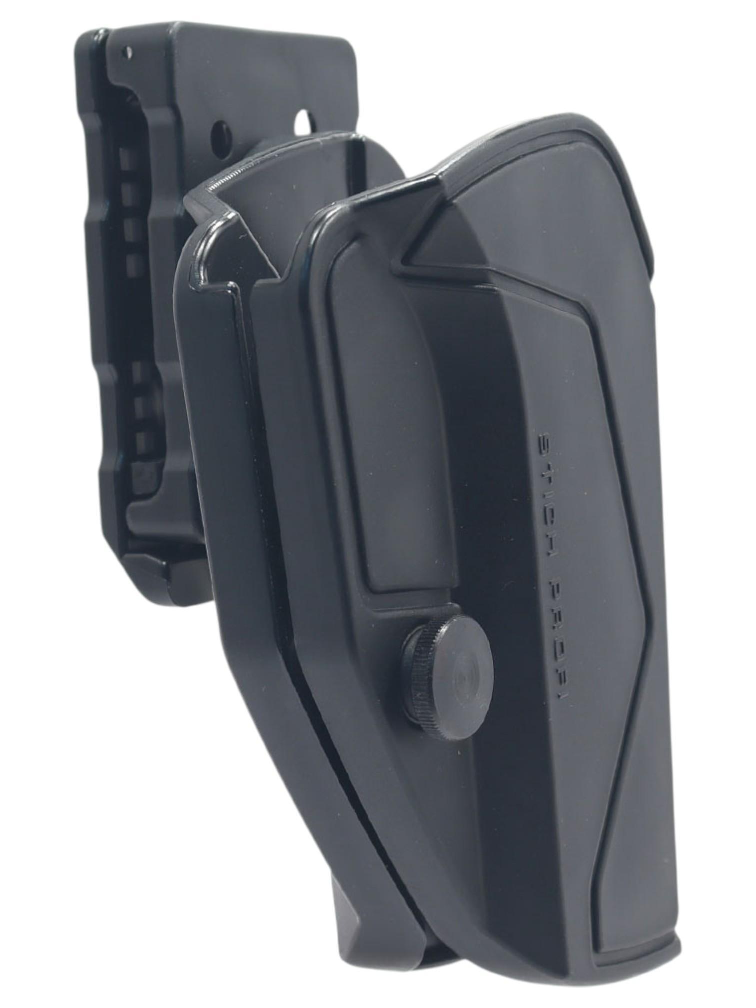 С внешней стороны расположен винт для регулировки силы фиксации оружия в кобуре, легко откручивается и закручивается без использования специальных инструментов.