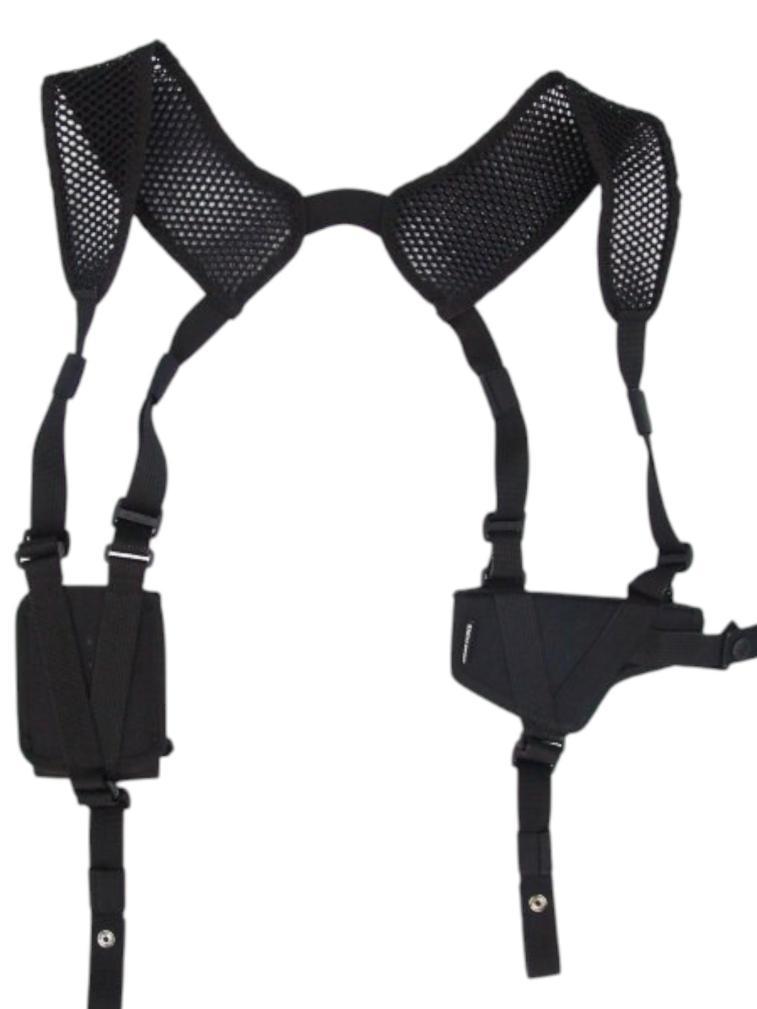 Наплечная оперативная текстильная кобура для пистолета с горизонтальным размещением оружия и подсумком под 2 запасных магазина.