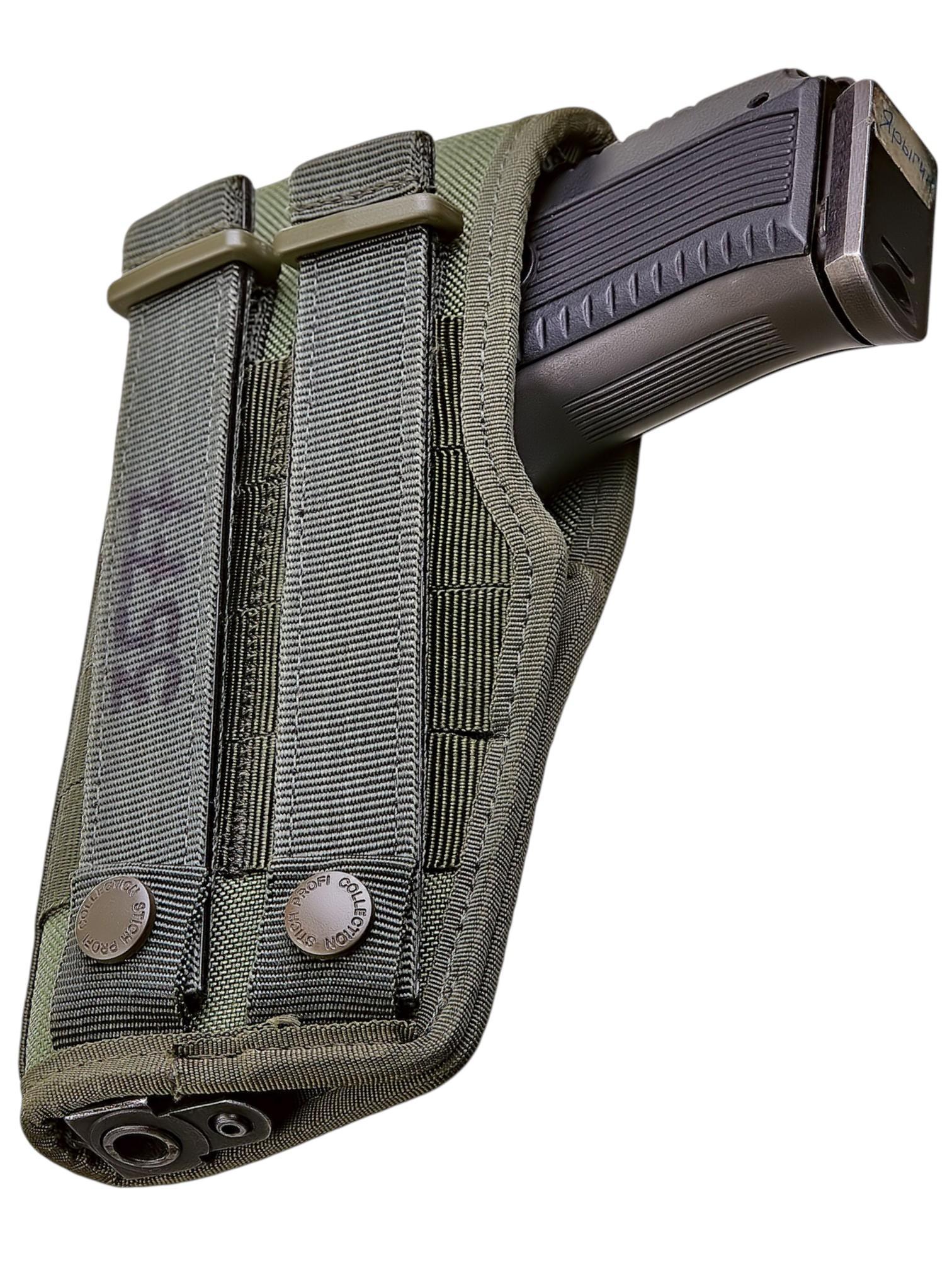 Тактическая кобура предназначается для применения вместе с современными разгрузочными и модульными системами нашего производства. Крепление кобуры осуществляется с помощью интерфейса M.O.L.L.E., что позволяет размещать пистолет в любом удобном месте на поясе, боку, груди и в прочих местах.