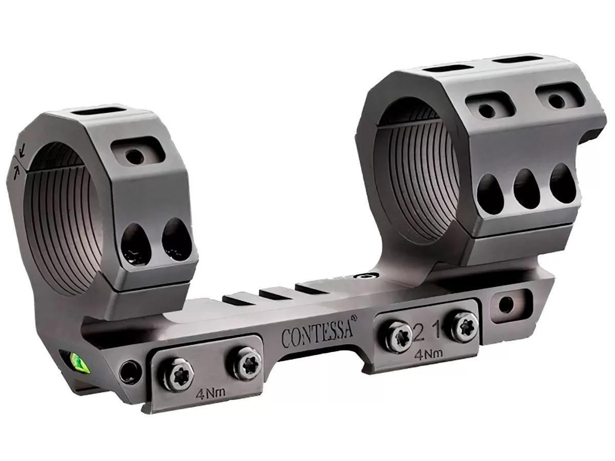 Contessa Ultra Tactical изготовлен из высококачественного алюминиевого сплава 7075, а крепёжные элементы выполнены из легированной стали с применением технологии Contessa Steel Insert System, что гарантирует стабильность и прецизионную точность сохранения выверки после снятия-установки кронштейна. Кольца не закрывают барабанчики ввода поправок и линию горизонта для удобства стрельбы.