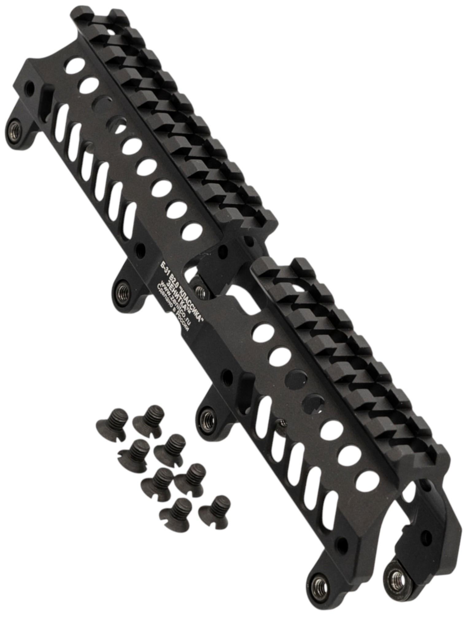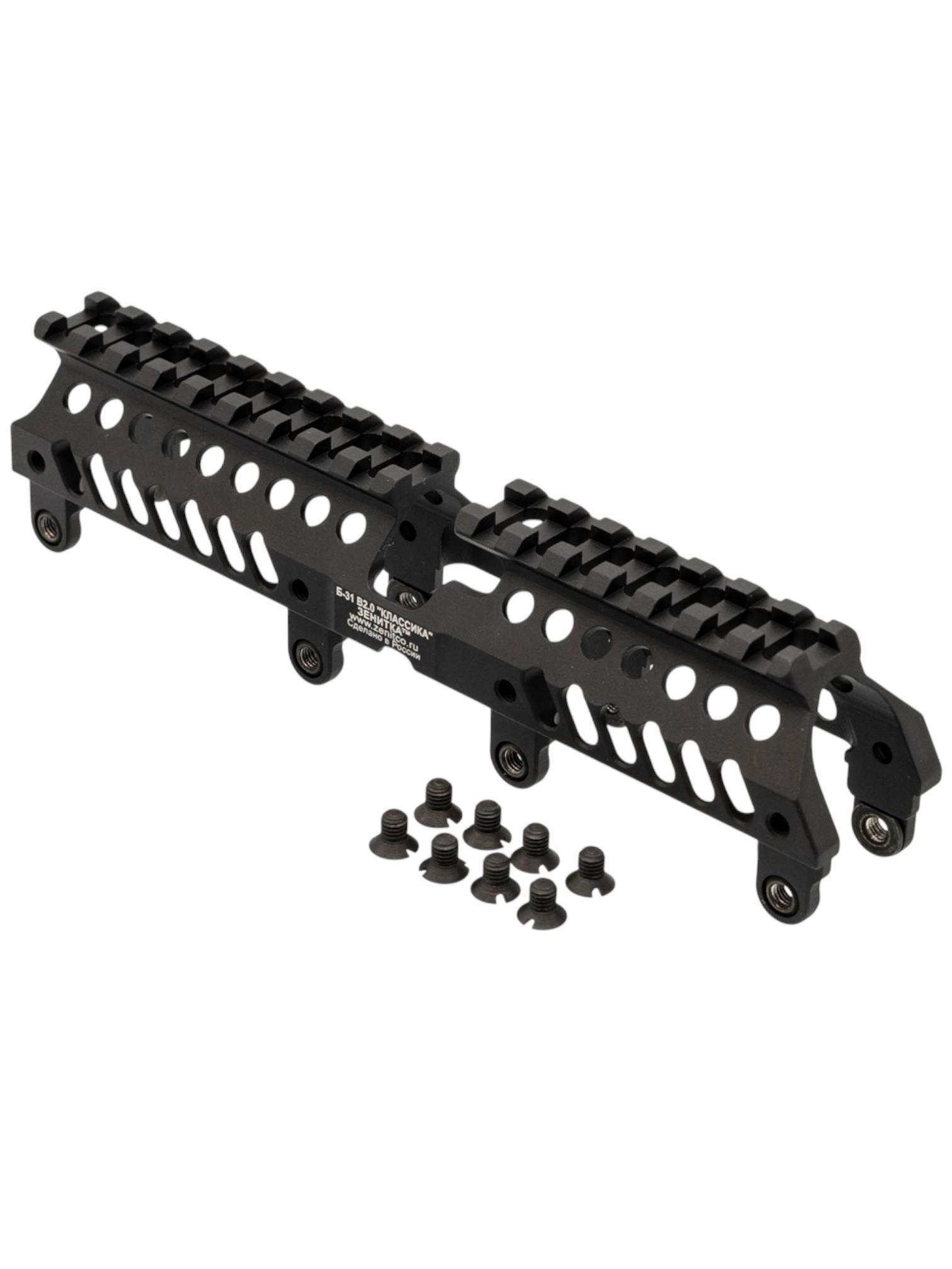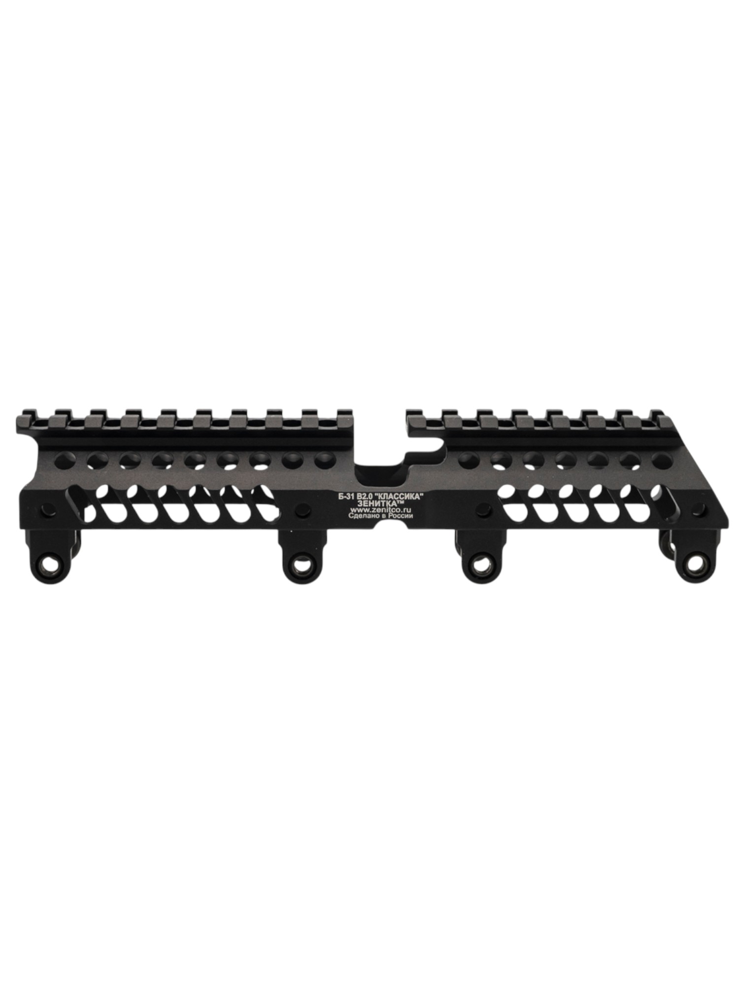 - Монтируется на цевья Б-30, Б-30У, а также комбинацию цевья Б-10Л и дополнительной насадки ДЛ-1 (либо совместно с комплектом Спорт-1 вместо кронштейна Б-31Л) посредством восьми винтов, формирует планку Пикатинни над стволом и газовой камерой АК длиной 185 ± 5 мм, не перекрывающую линию механического прицела.