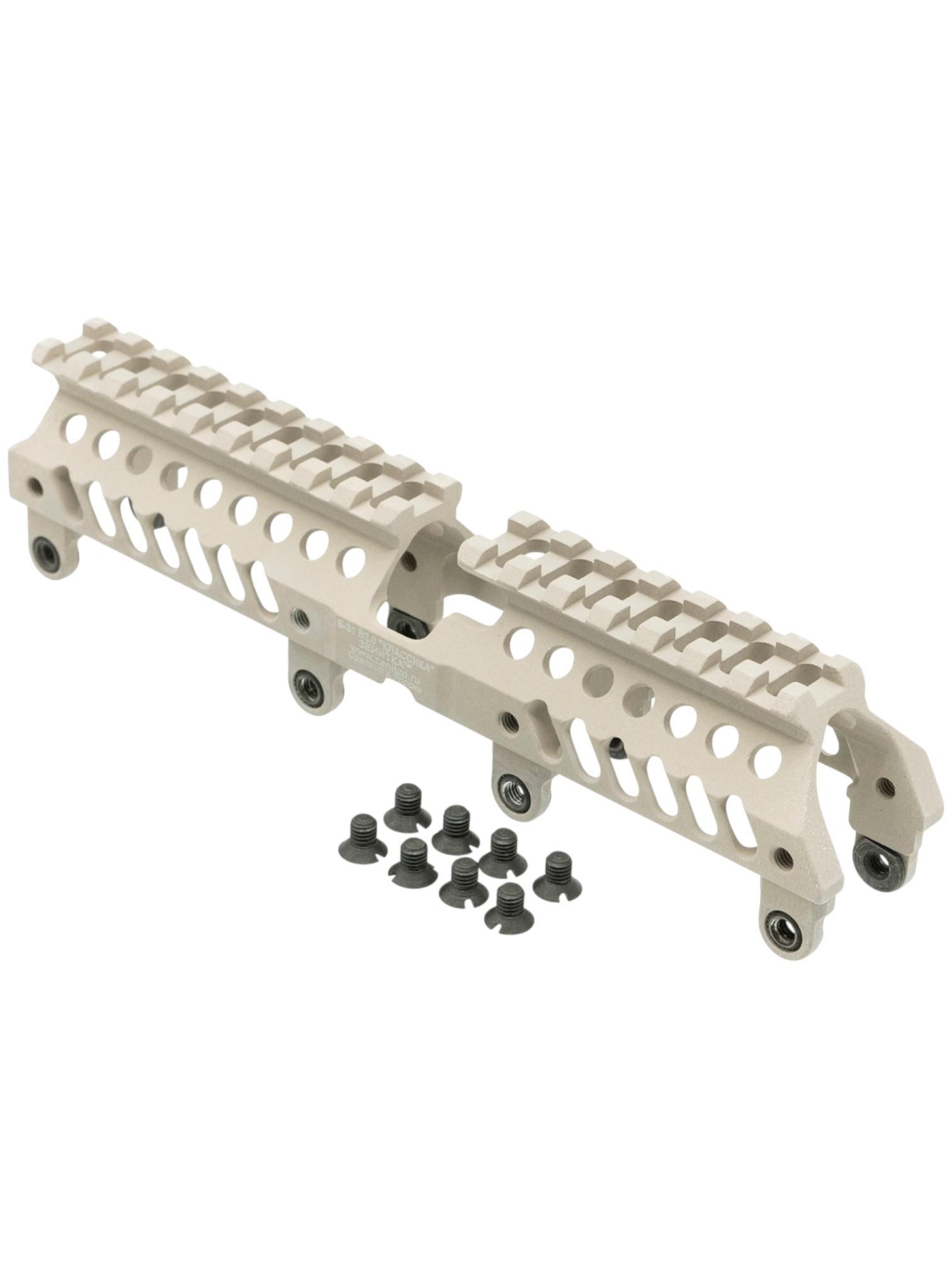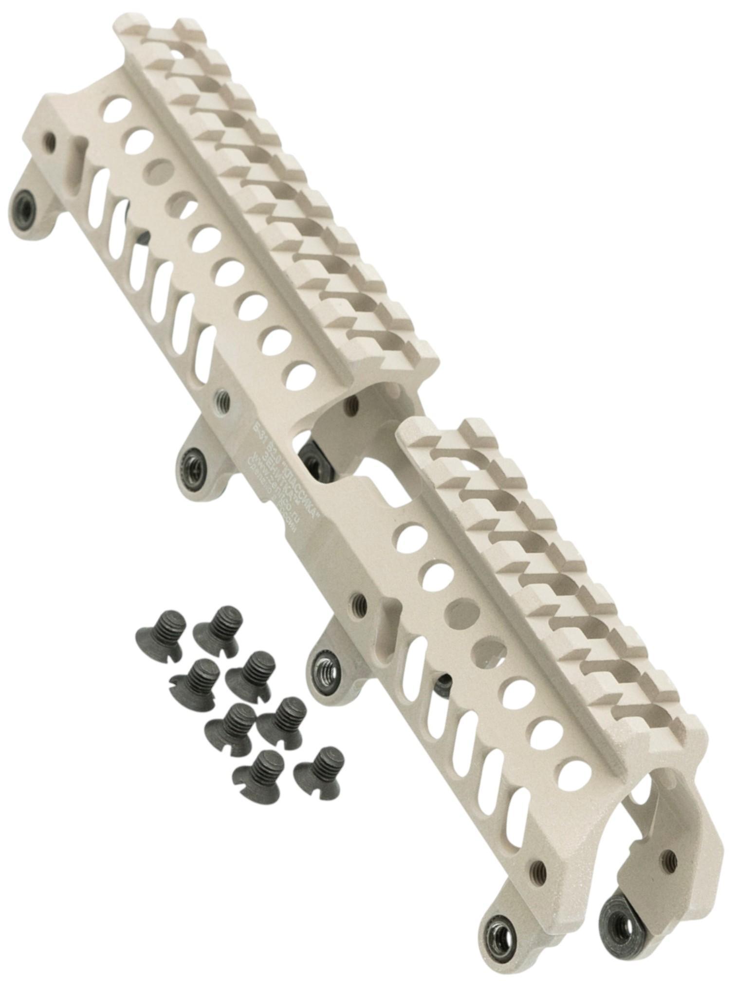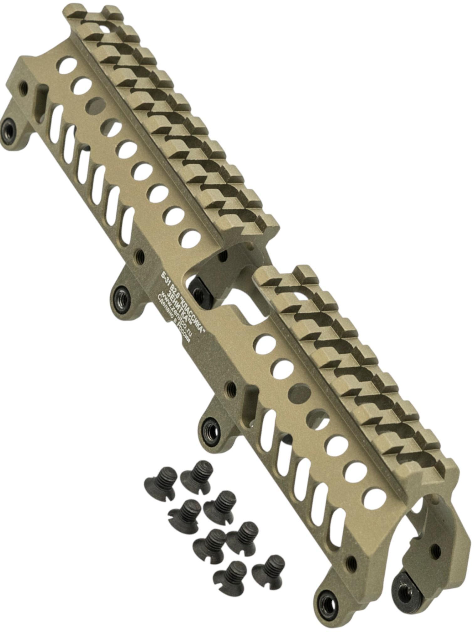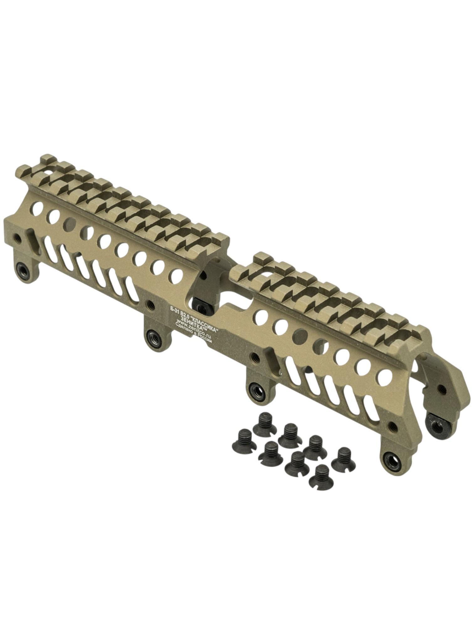 - Монтируется на цевья Б-30, Б-30У, а также комбинацию цевья Б-10Л и дополнительной насадки ДЛ-1 (либо совместно с комплектом Спорт-1 вместо кронштейна Б-31Л) посредством восьми винтов, формирует планку Пикатинни над стволом и газовой камерой АК длиной 185 ± 5 мм, не перекрывающую линию механического прицела.