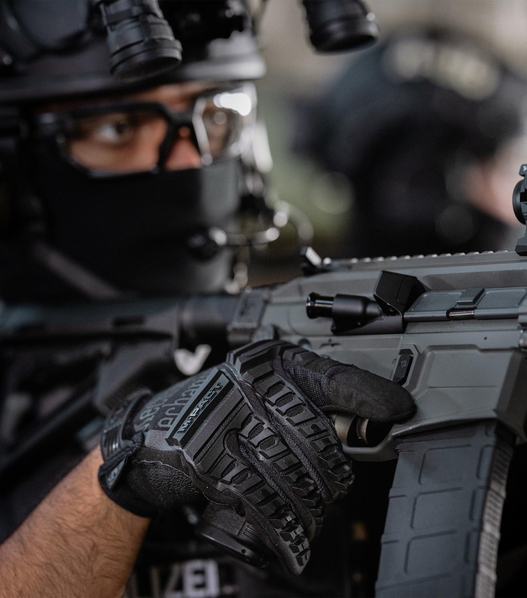 Указательный и большой палец дополнительно усилены и снабжены рельефной поверхностью для лучшего сцепления с инструментом. У основания пальцев расположена специальная панель, повышающая контроль и устойчивость захвата.