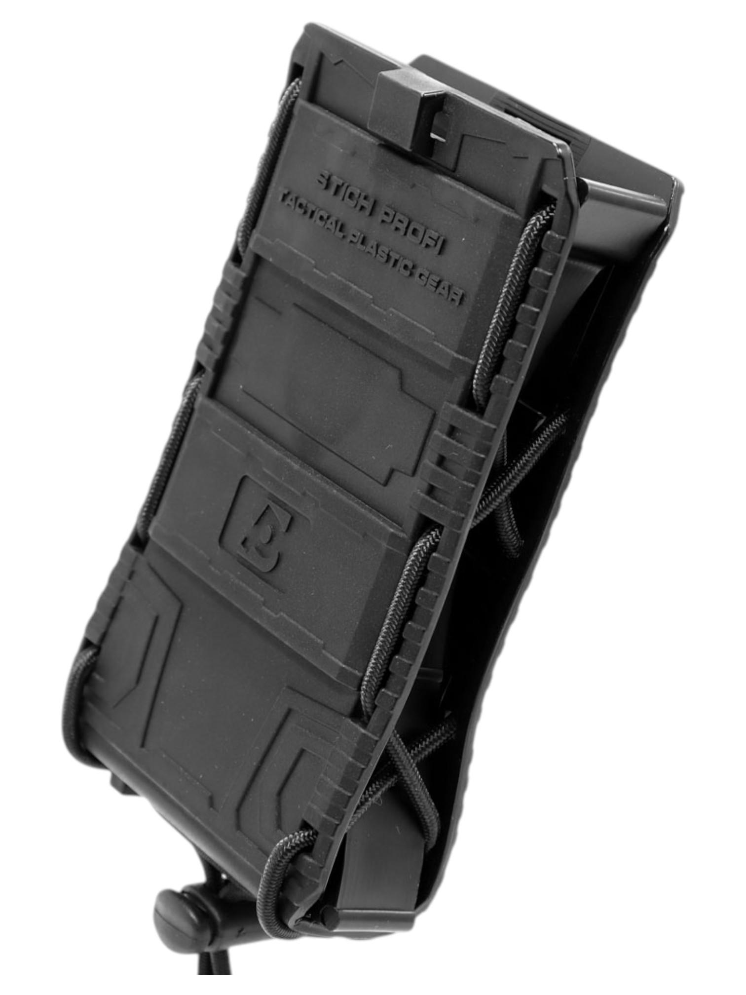Специальная форма пластиковой рамы позволяет интуитивно размещать магазин в подсумке. Кроме того, пластиковый каркас позволяет надежно удерживать магазин, исключая самопроизвольное выпадение и утерю магазина. Дополнительным элементом крепления является утягивающий жгут — с его помощью регулируется сила удержания магазина.