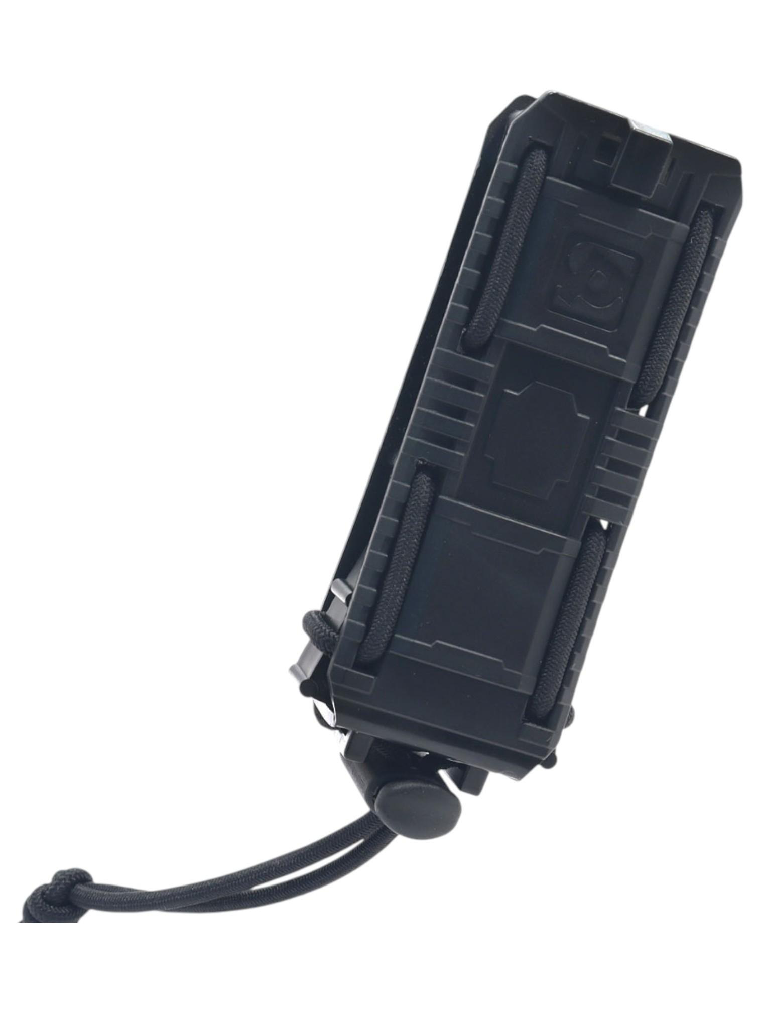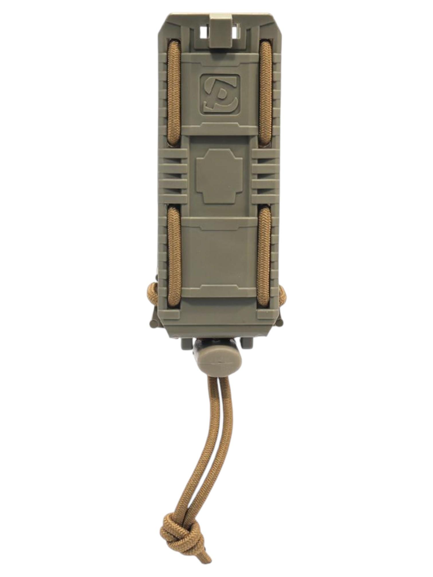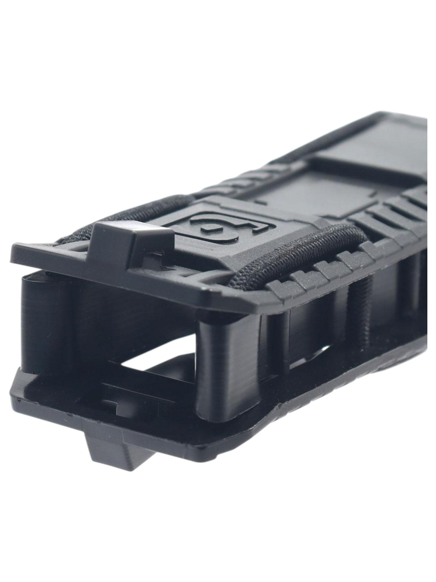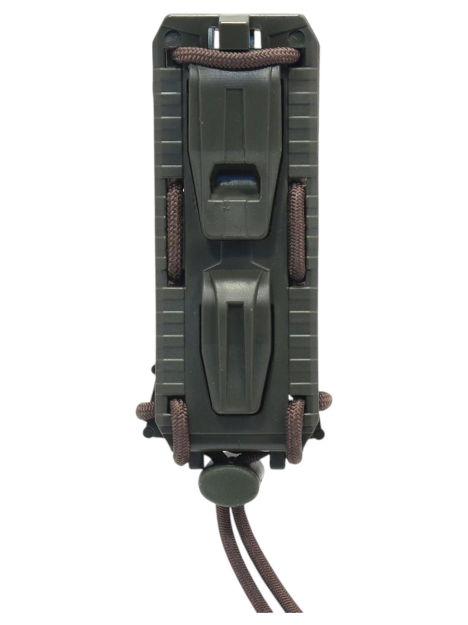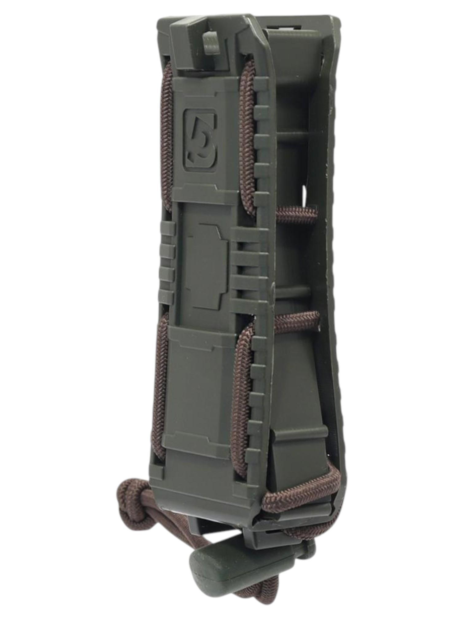 Подсумок изготовлен из высокопрочного прорезиненного пластика, что обеспечивает его долговечность и надёжность. Благодаря специальному креплению без строп Molle, он легко устанавливается и прочно держится на снаряжении. При желании также можно приобрести страховочный жгут для дополнительной защиты и уверенной фиксации магазинов.