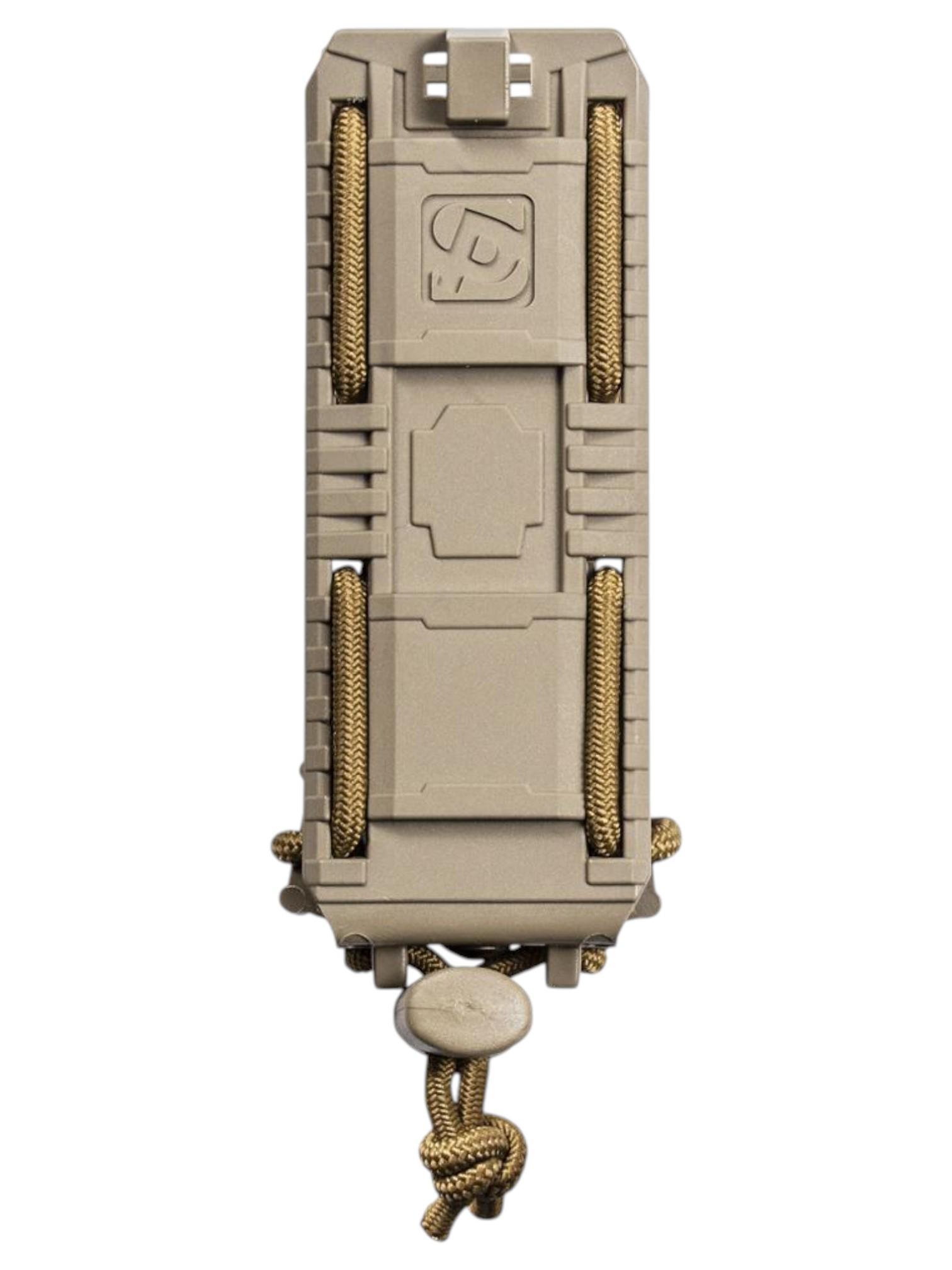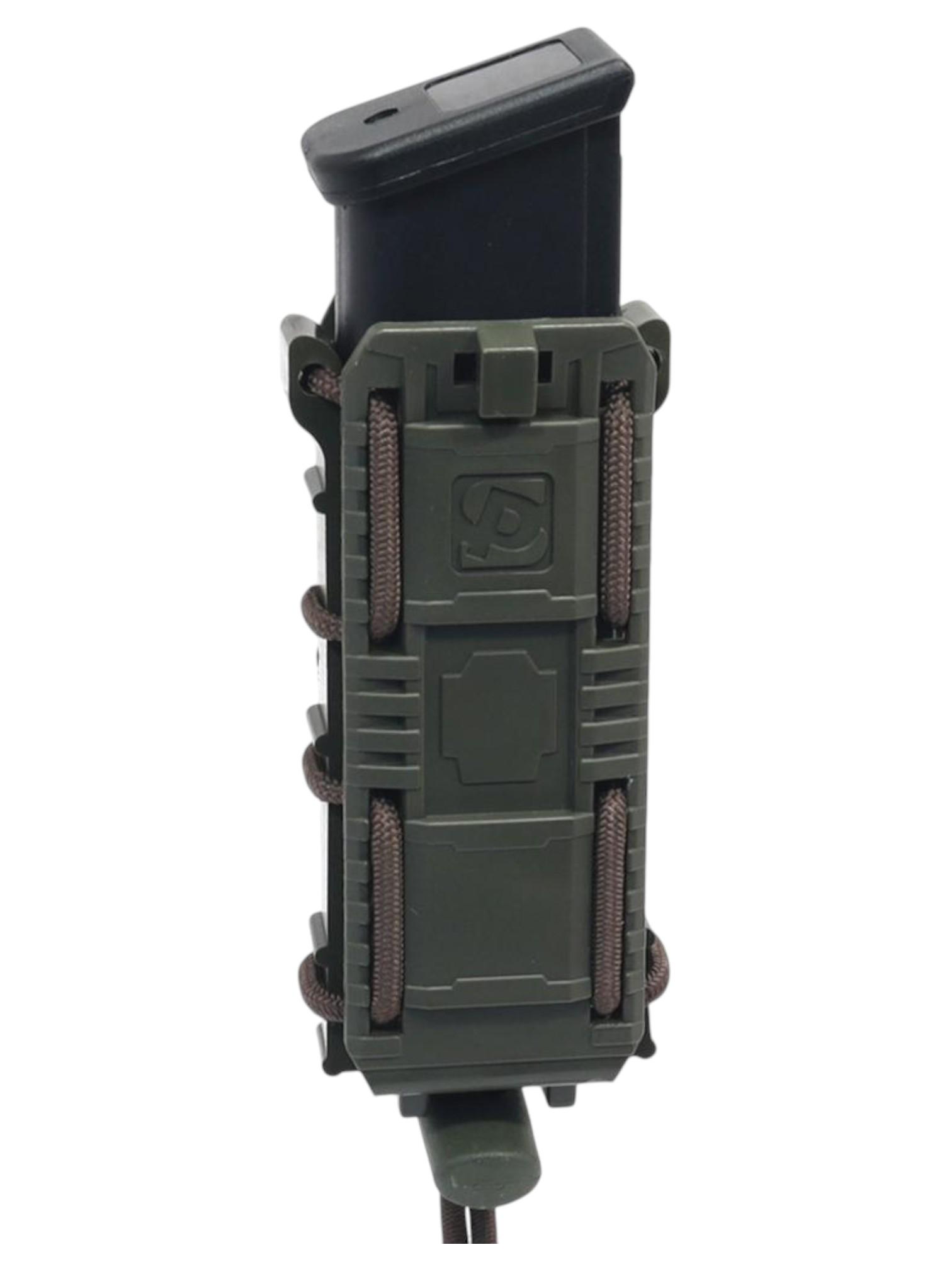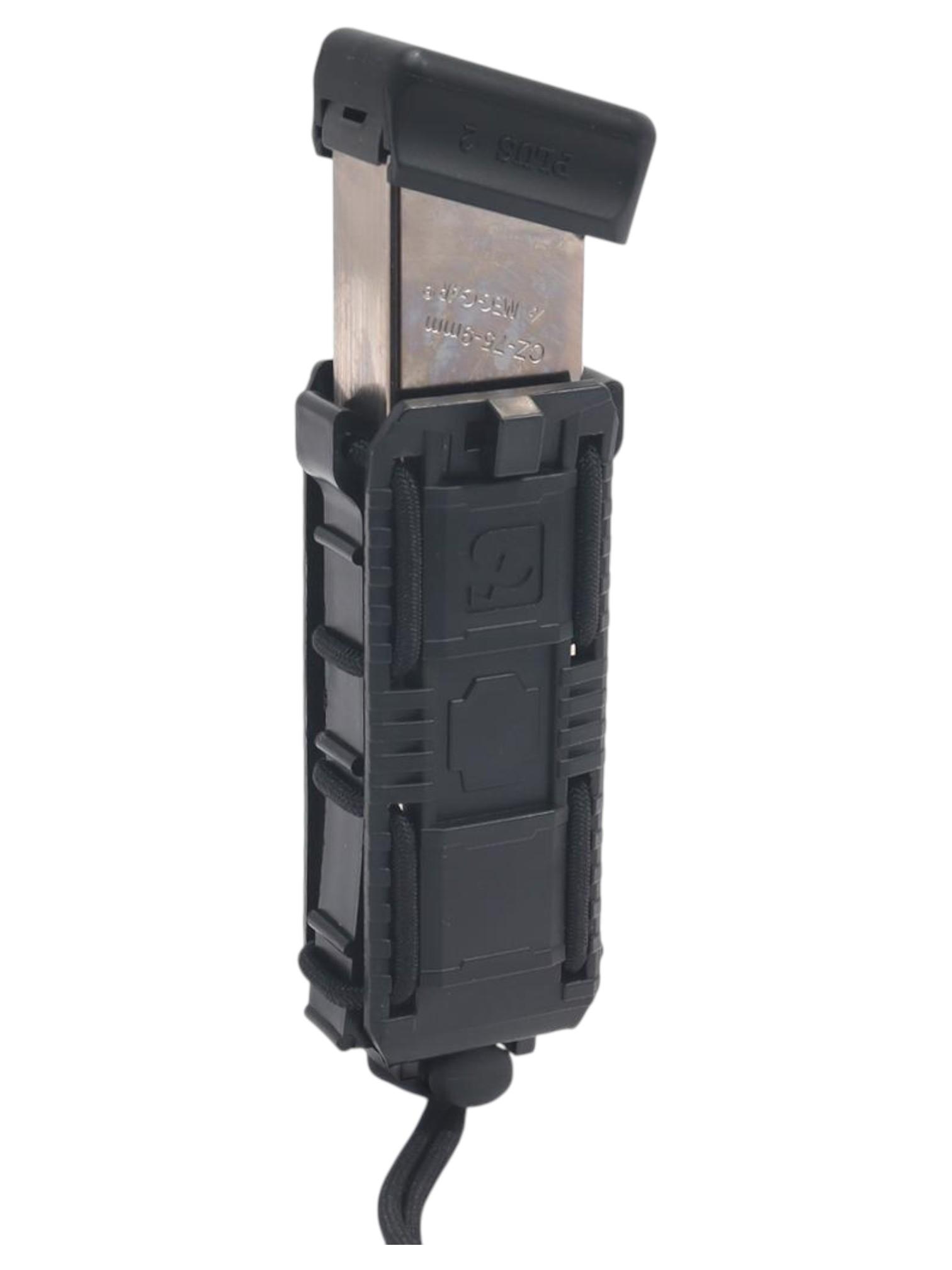 Открытый подсумок для пистолетных магазинов, обеспечивающий надежную фиксацию благодаря прочному пластиковому каркасу и утягивающемуся жгуту. Этот уникальный жгут затягивается таким образом, чтобы обеспечить легкий доступ к магазину, сохраняя его безопасность и предотвращая выпадение или потерю.