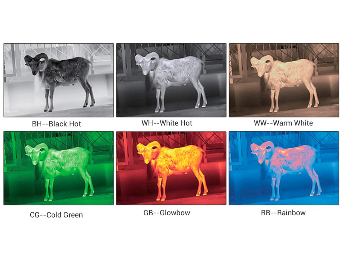- 6 цветовых палитр: Black Hot, White Hot, Warm Wite, Cold Green, Glowbow, Rainbow