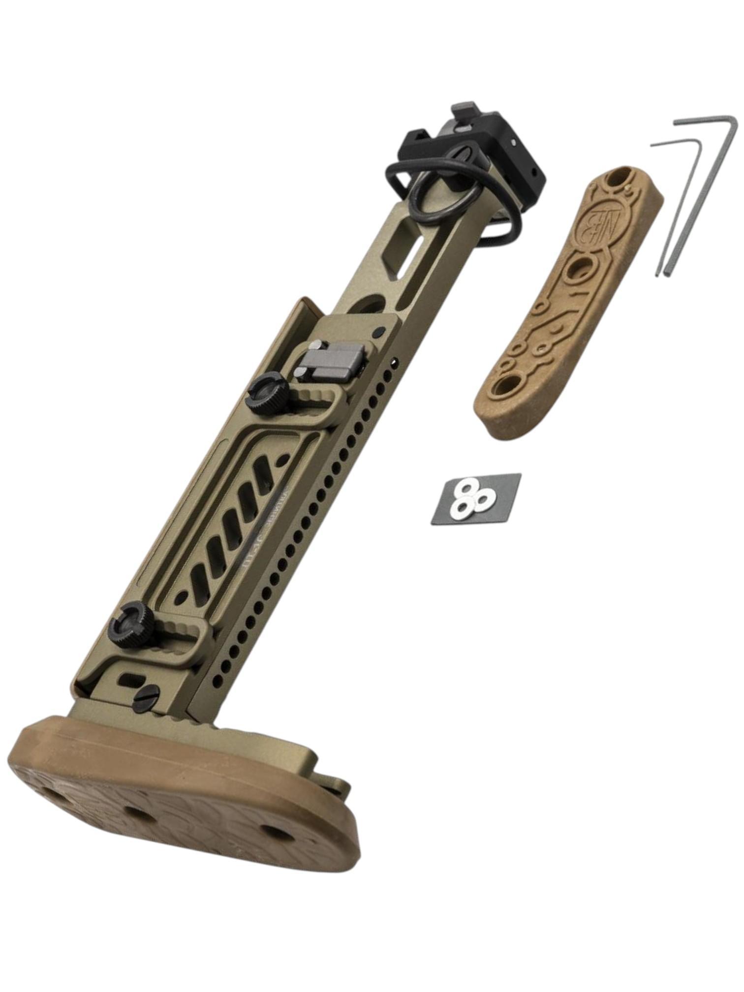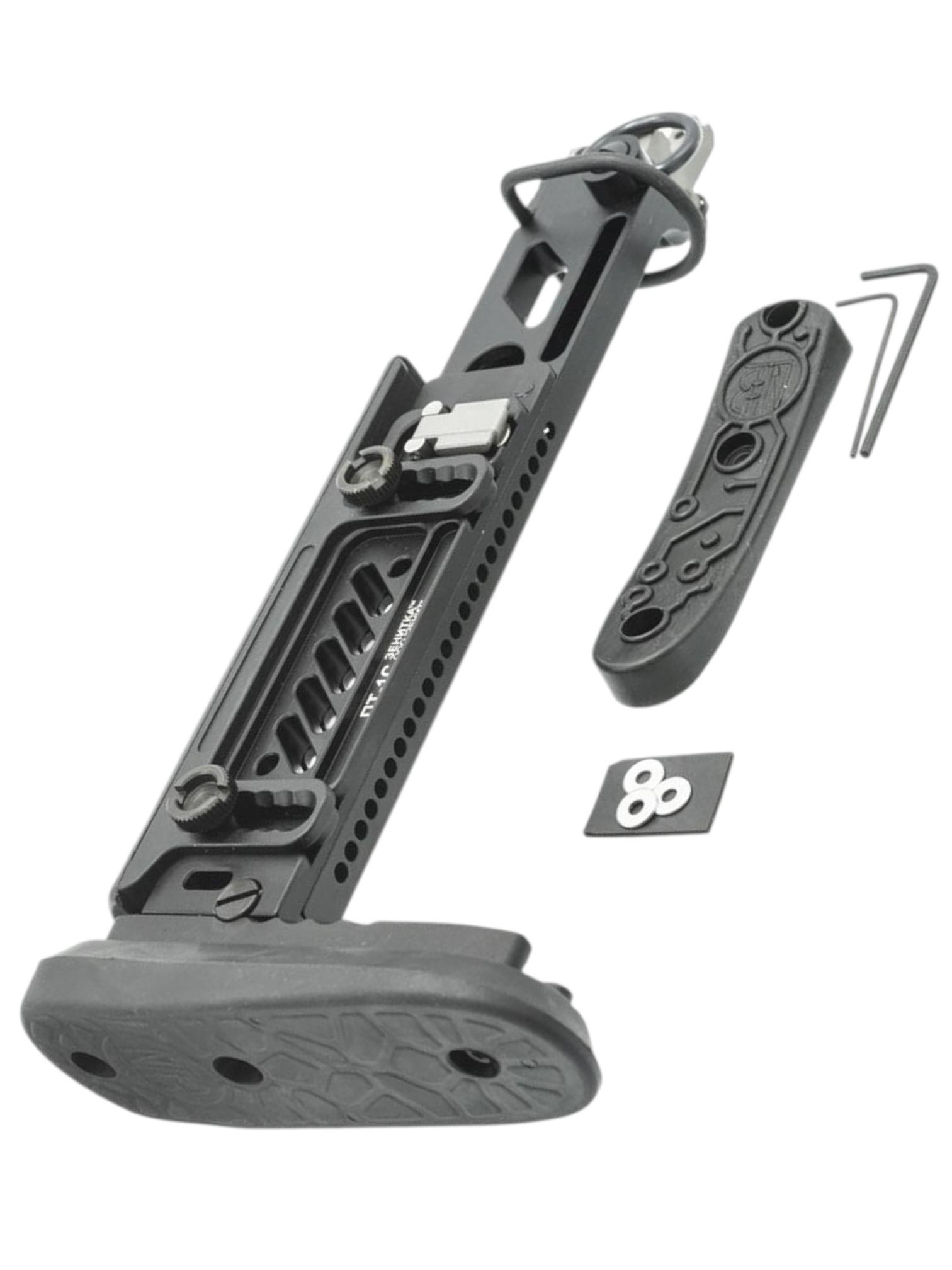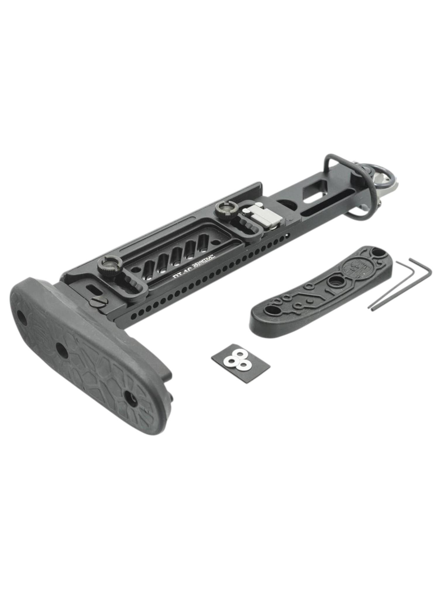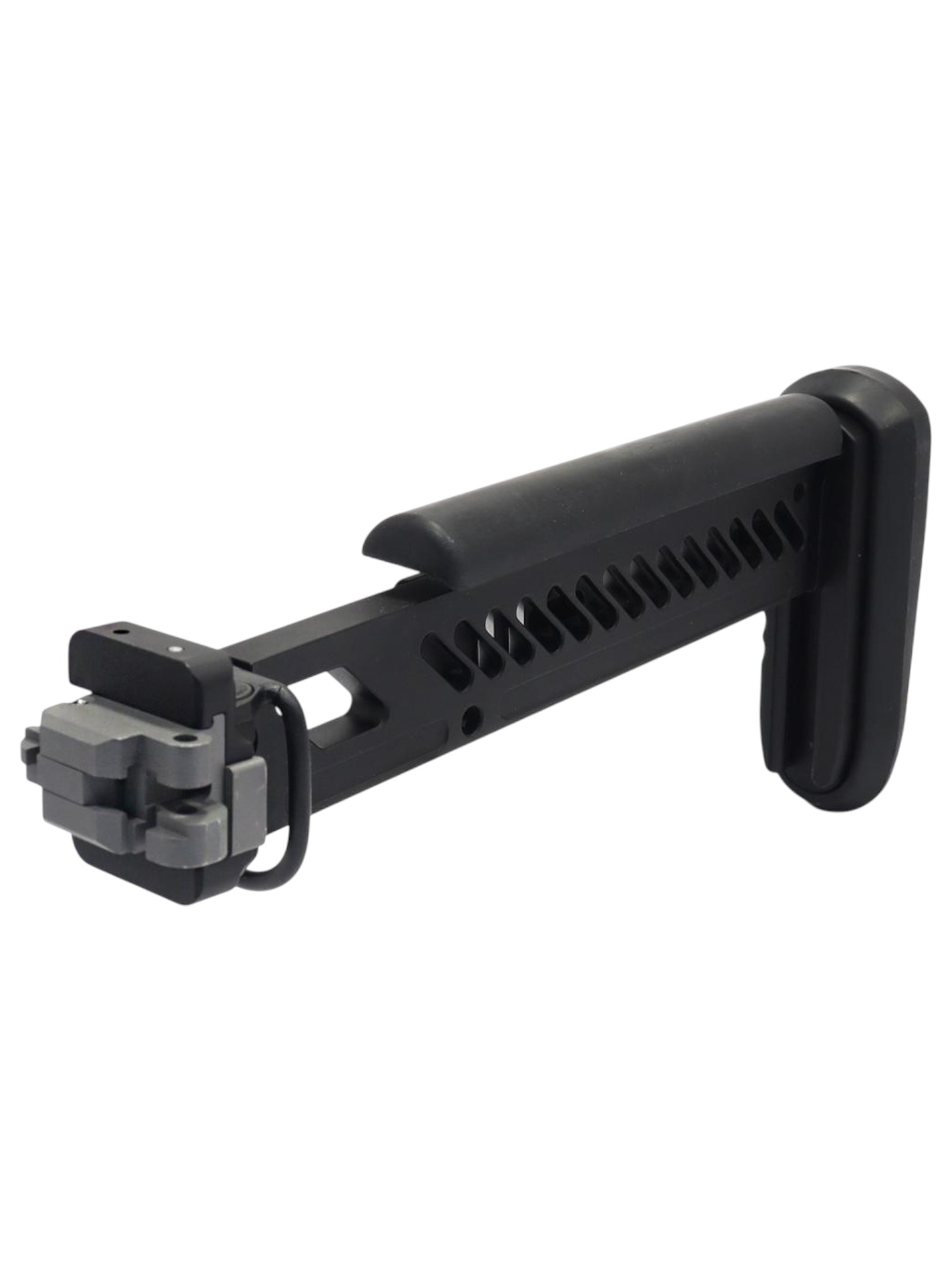 – оригинальный механизм позволяет складывать и фиксировать приклад вдоль ствольной коробки оружия в любом положении телескопического механизма, высоты щеки и высоты тыльника;