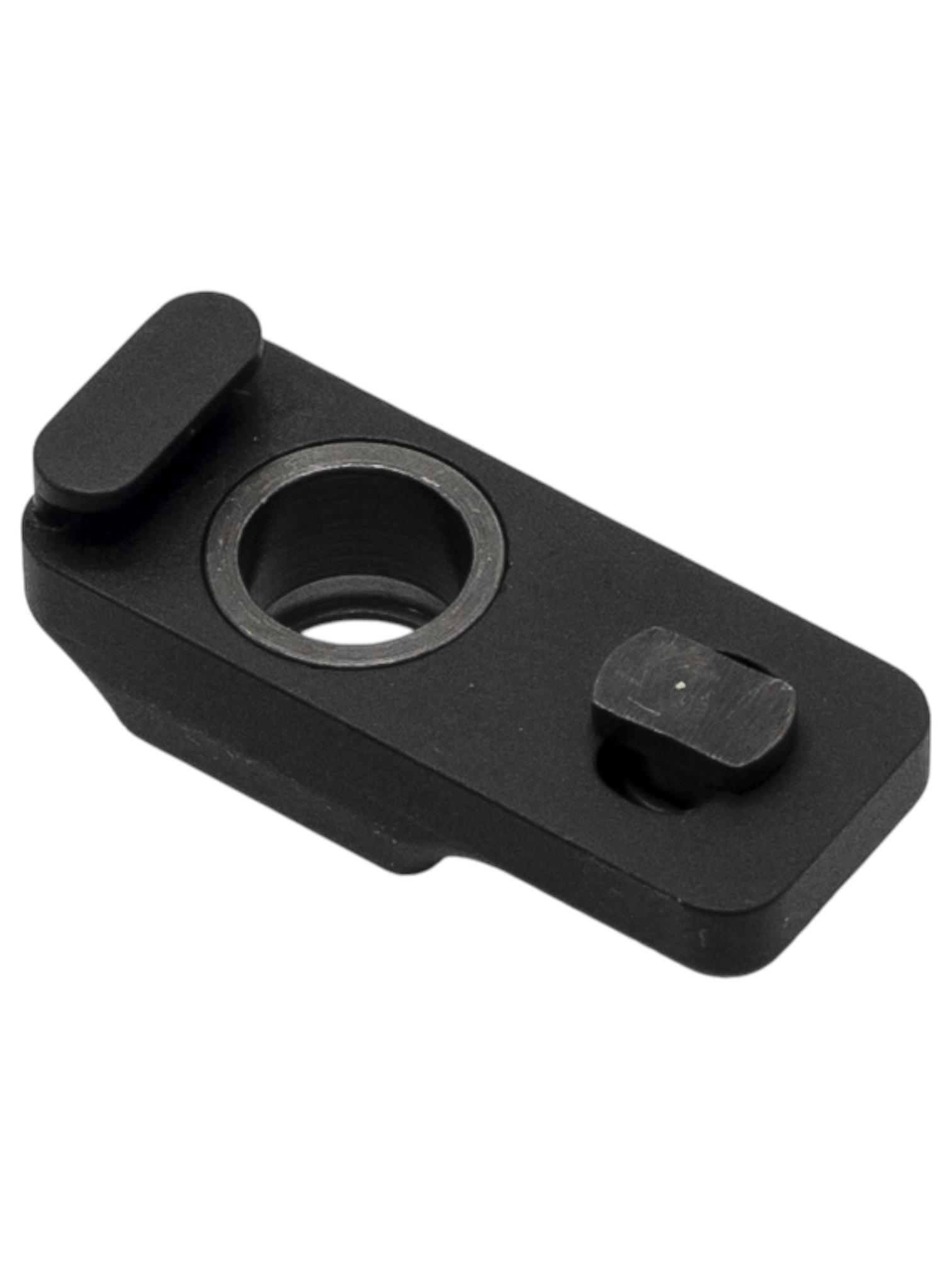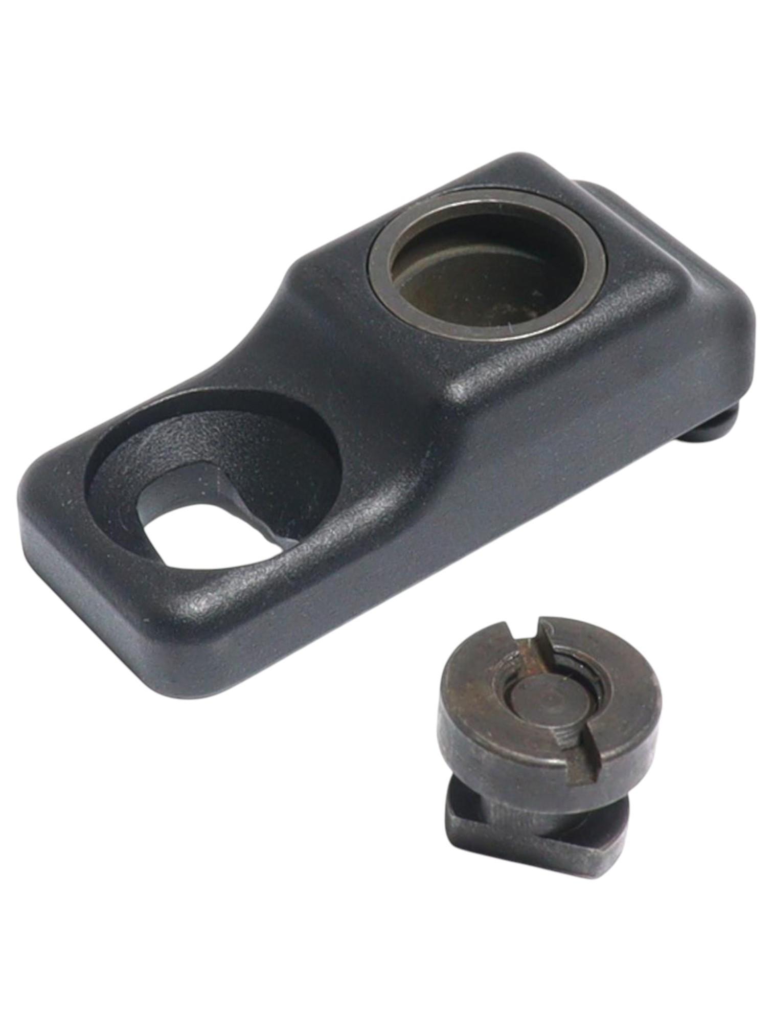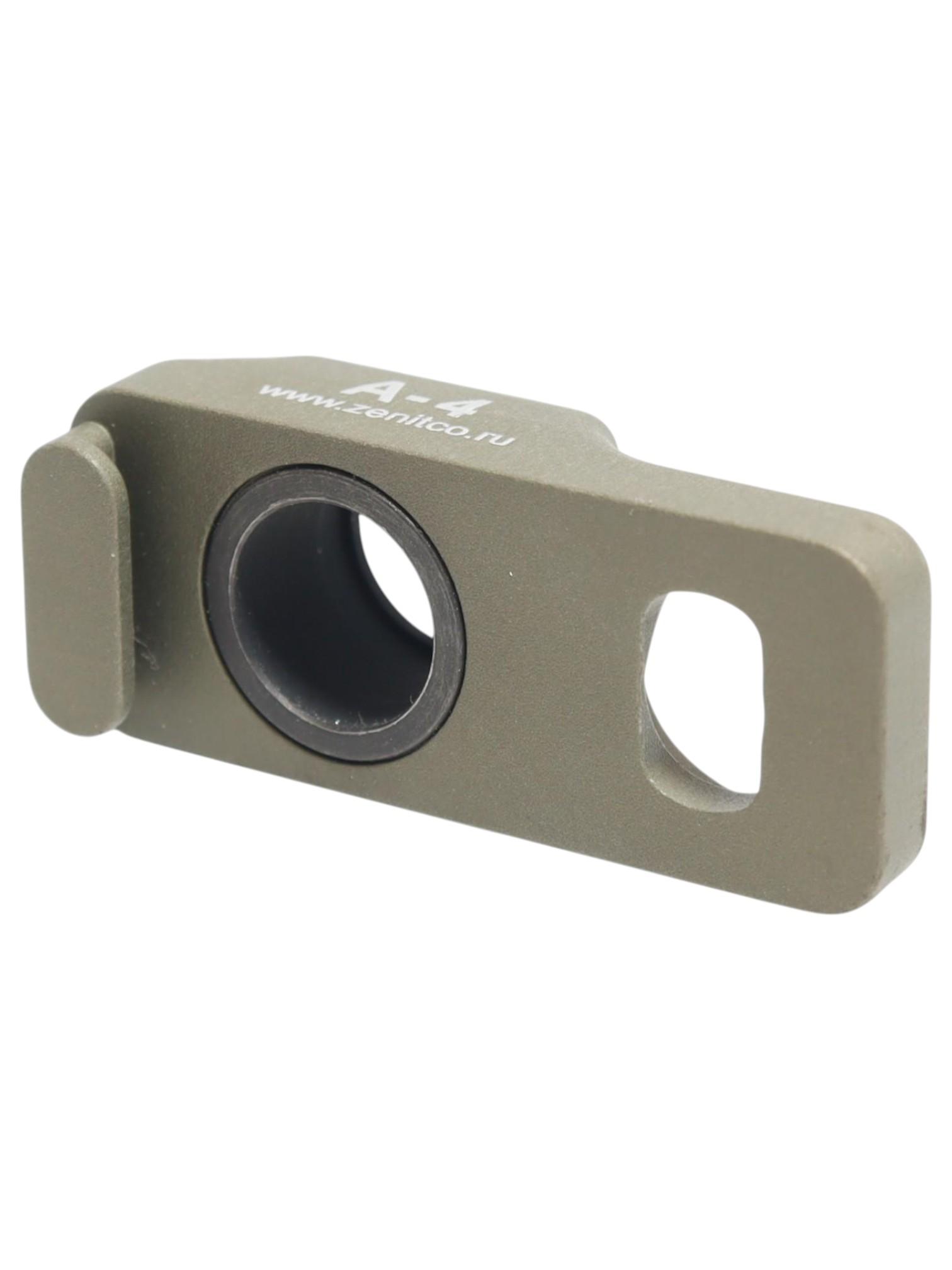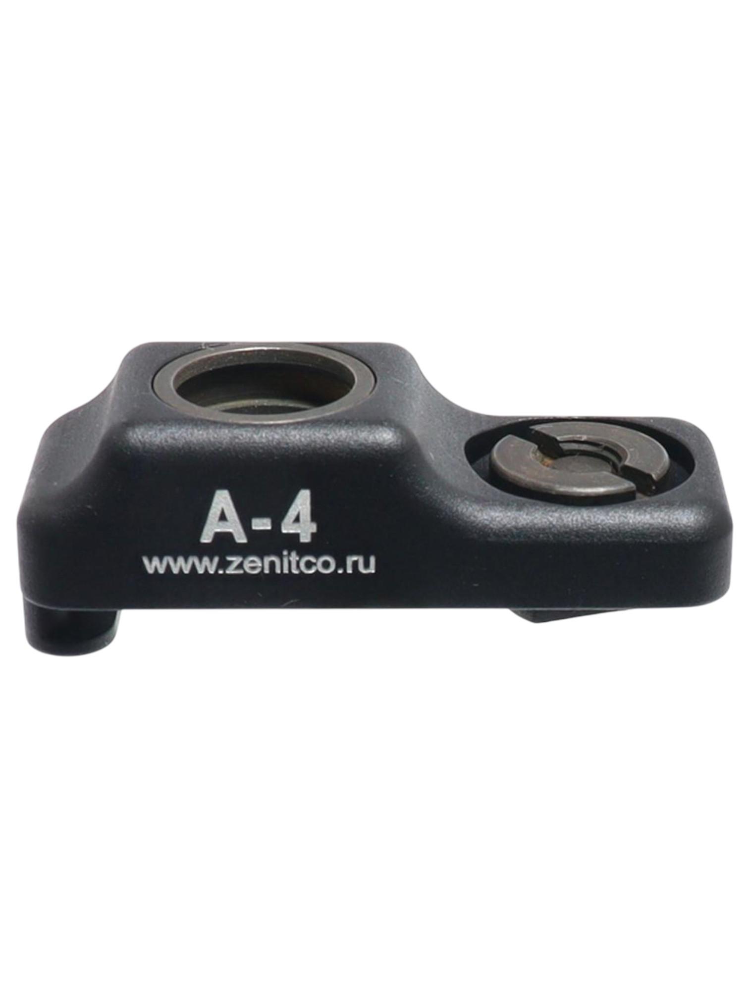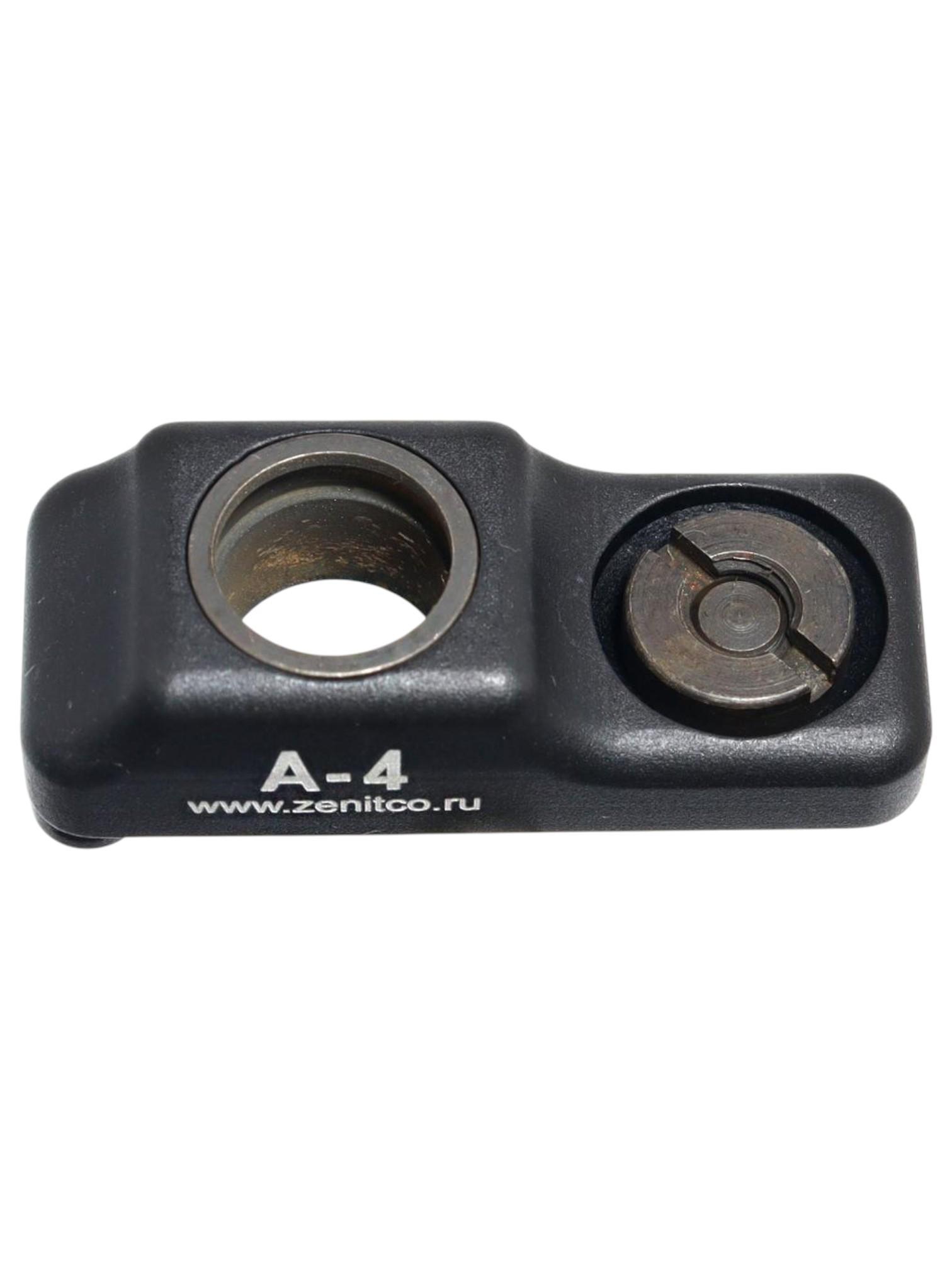 Разъем для QD антабки А-4, произведенный компанией Зенит, представляет собой тщательно фрезерованное изделие из сплава Д16Т с покрытием черного цвета. Разъем обеспечивает прочное крепление на направляющей системе "Базис" и предназначен для надежной фиксации быстросъемных QD антабок на цевье.