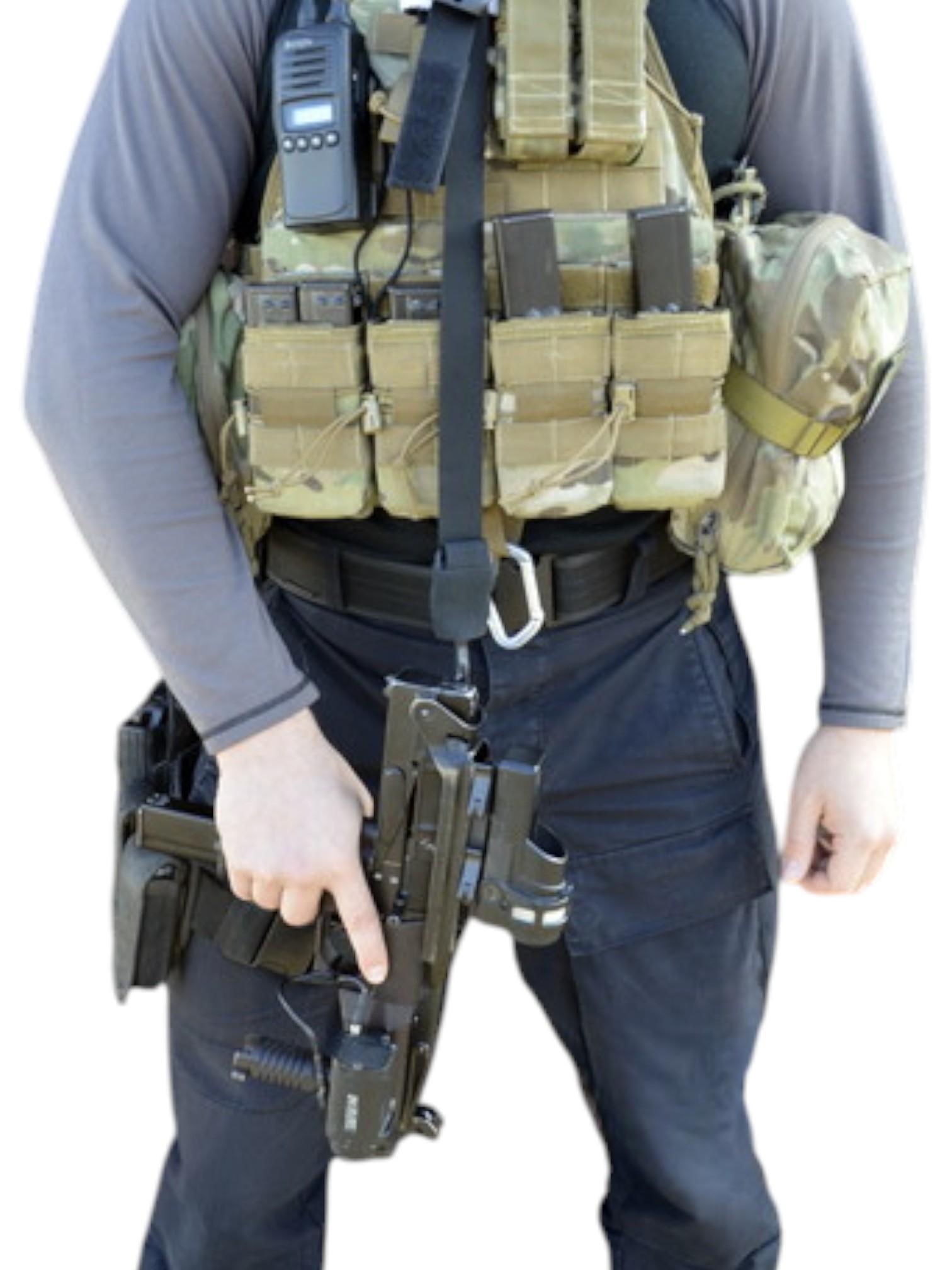 В одно движение ремень плотно притягивает оружие к корпусу, освобождая руки, или позволяет отпустить его на вытянутую левую руку для стрельбы со слабого плеча и передвижения ползком.