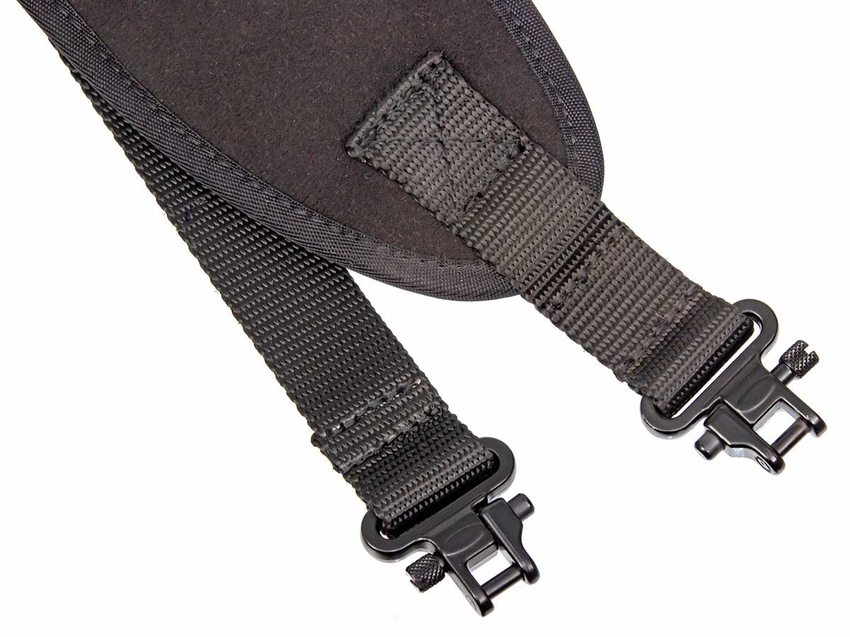 Оружейный ремень имеет мягкую плечевую накладку (погон) шириной 8 см, повышающую удобство ношения оружия. Внутренняя сторона погона выполнена из неопрена, благодаря чему ремень не скользит по одежде и надёжно удерживает оружие на плече. Остальная часть ружейного ремня изготовлена из нейлоновой стропы шириной 25 мм, регулируемой по длине.
