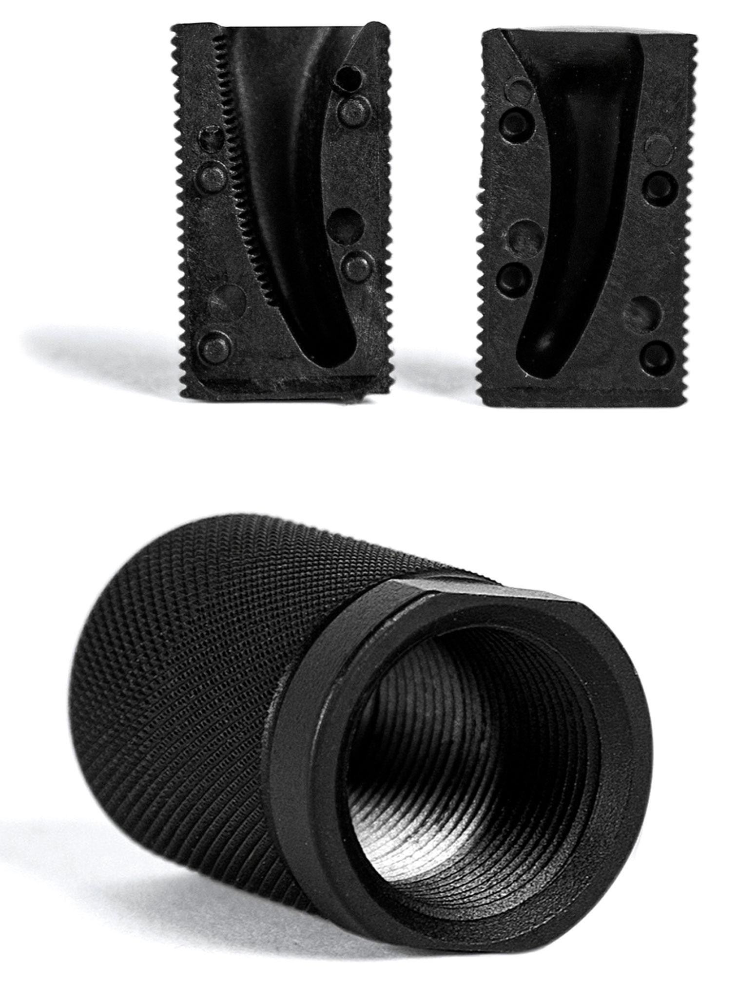 Изменения коснулись способа крепления на рукояти: в то время как традиционные накладки предполагают фиксацию с помощью болта, в новой модели используется полимерный вкладыш, сформированный под изгиб карабина и снабжённый наружной резьбой для посадки алюминиевой крышки. Это обеспечивает надёжную плотную посадку.