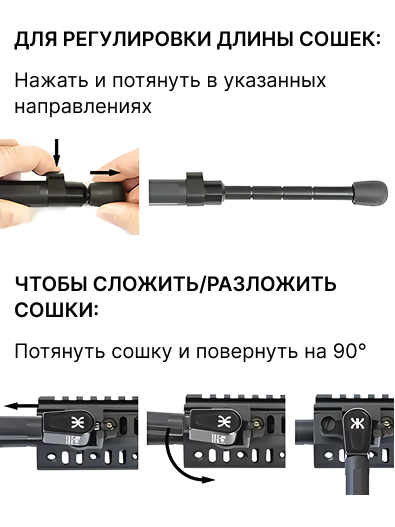 Длина сошек меняется простым движением: нужно нажать и вытянуть элементы в нужном направлении (см.фото). Для складывания и раскладывания сошку тянут и поворачивают на 90 градусов.